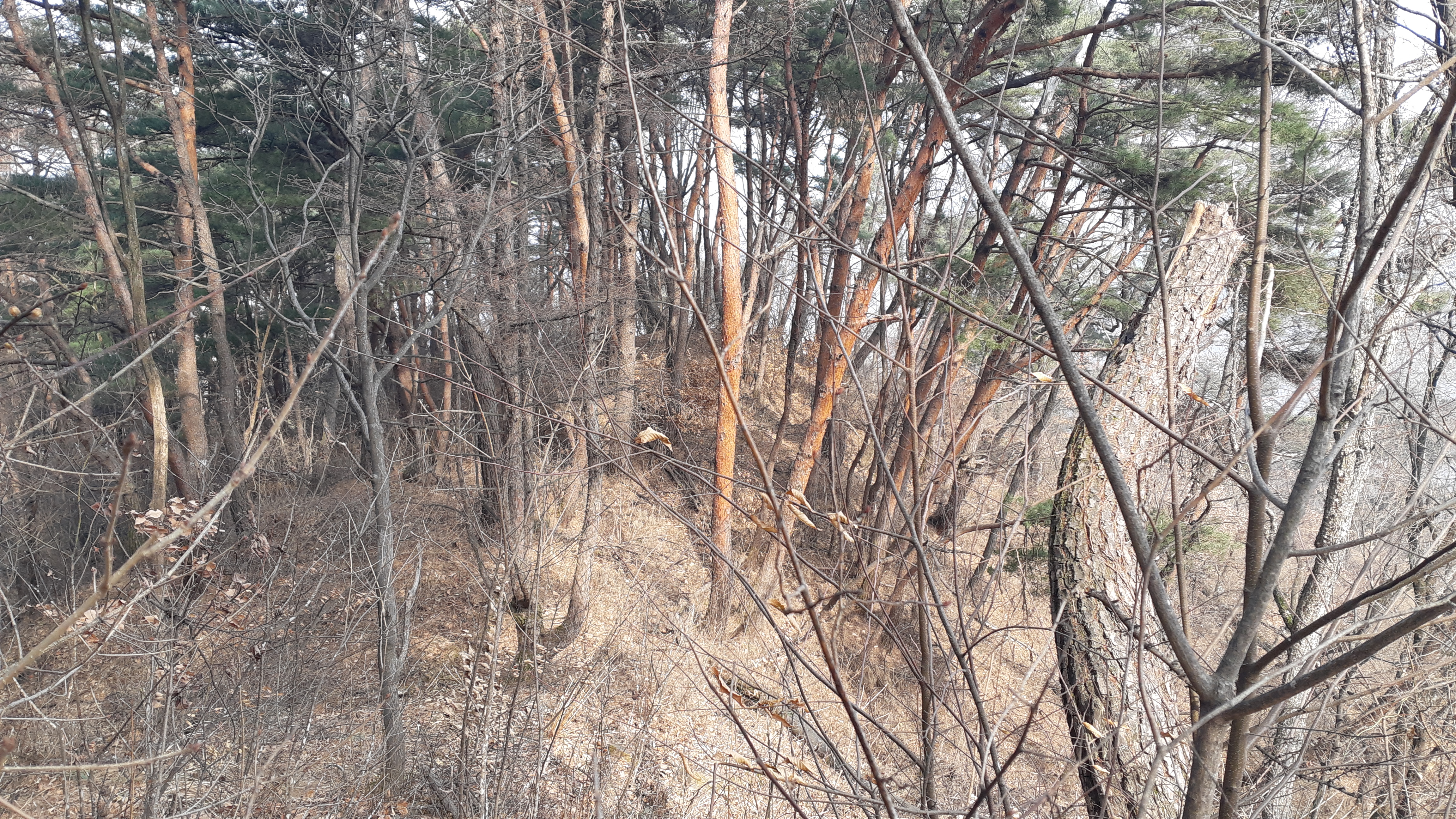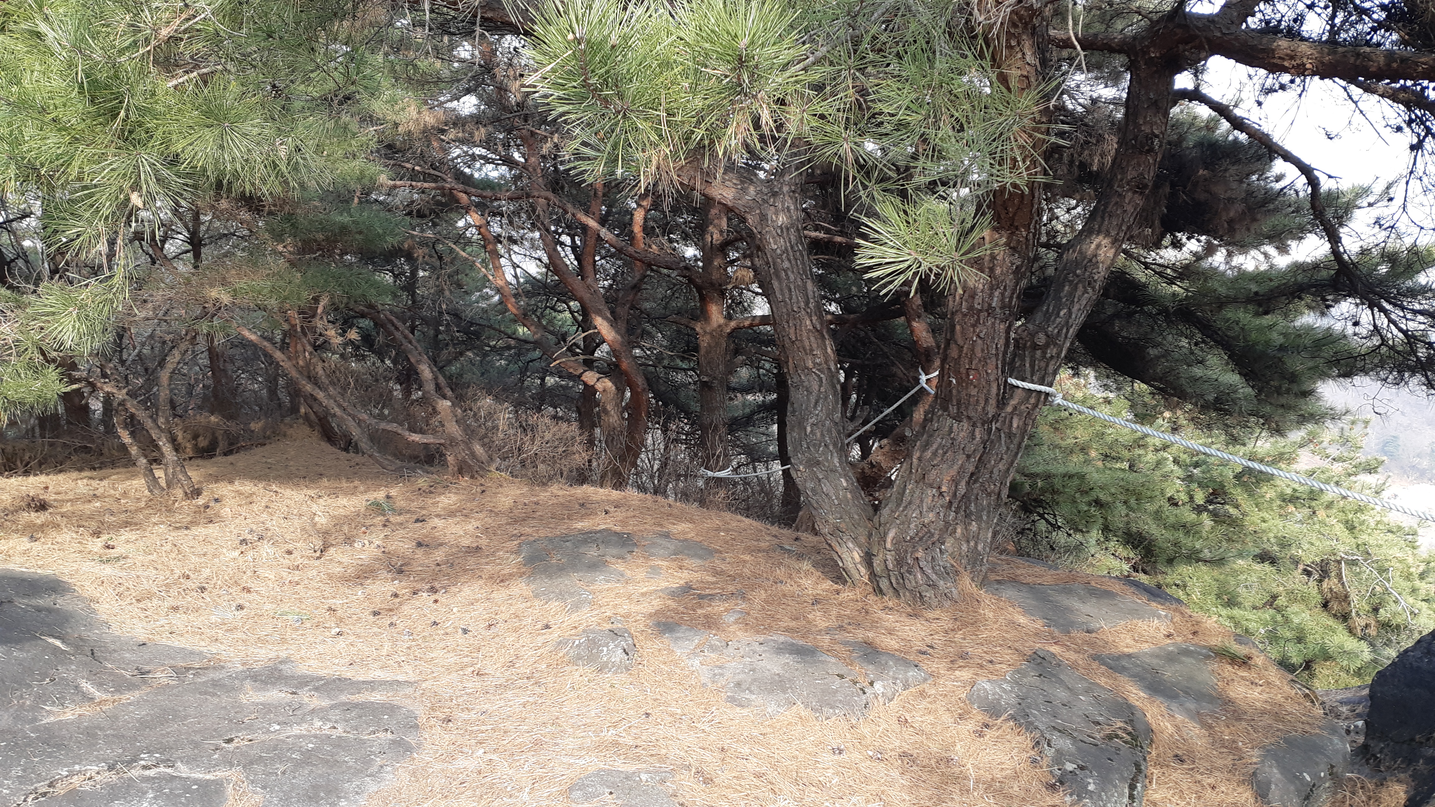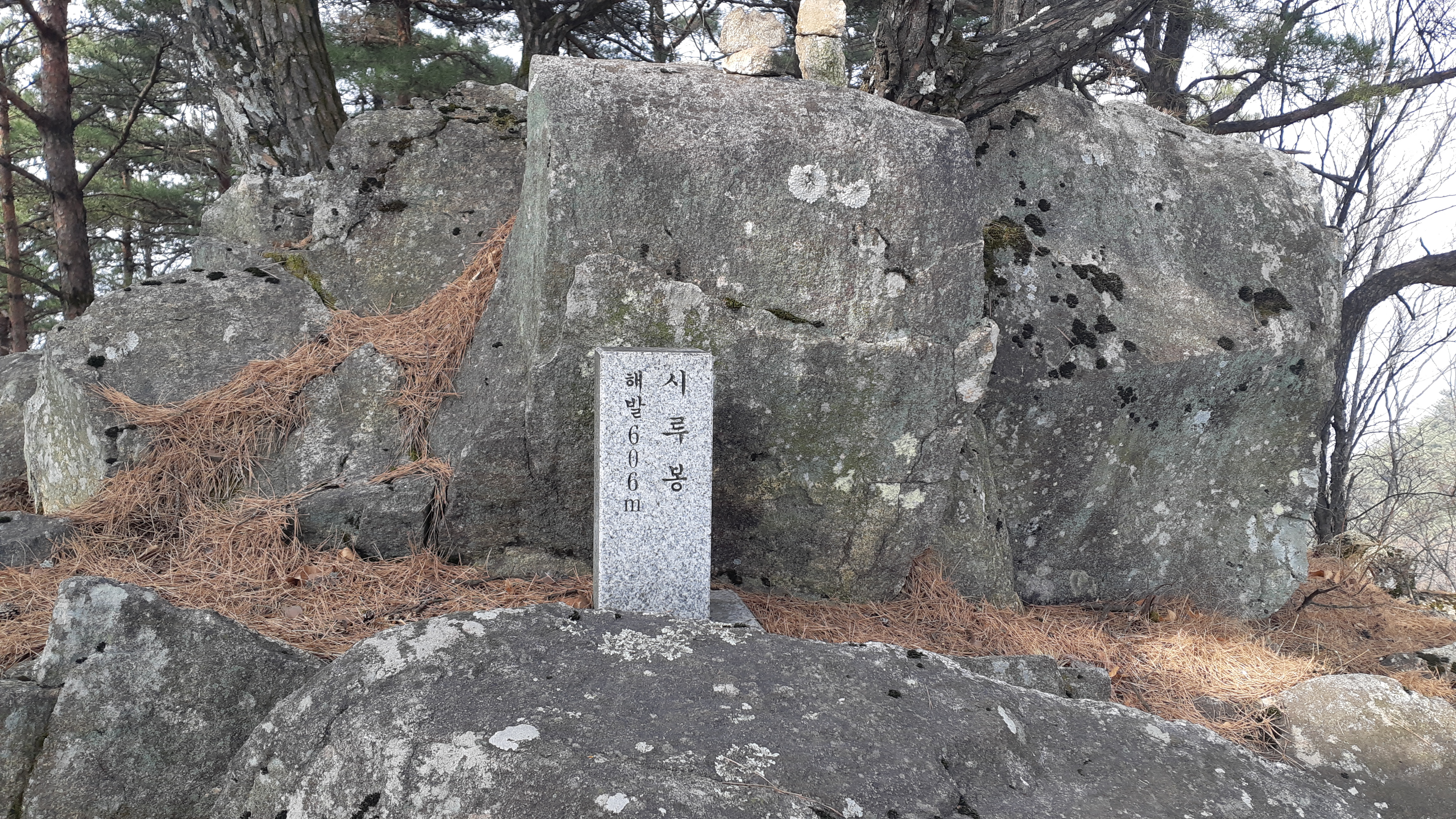 표시기 몇 걸린 등지리봉을 지나 솔 갈비 짙게 깔린 능선을 10여분 진행하면 정상 표지판인 ‘영주 주마산 544’가 참나무에 걸린 주마산 정상에 도착한다. 정상에서 몇 걸음 옮겨 왼쪽에 거북을 닮은 바위에 서면 왼쪽으로 자구지맥의 자구산 방향이 조망된다만 미세먼지로 희미한 게 정말 아쉽다. 그러나 이곳에서 이른 점심(11:21~11:40) 식사를 하고 출발한다. 식사 후 잠시 진행하면 무릎재인데 건너편으로 곧 진행할 누에머리와 뒤쪽의 시루봉이 희미하게나마 조망이 된다. 시멘포장이 된 무릎재를 지나 올라서며 데크계단이 나오고 이어 누에머리봉에 오른다. 왼쪽으로 희미하나마 자구지맥의 달밭산을 조망하고 다시금 오름길로 진행한다.