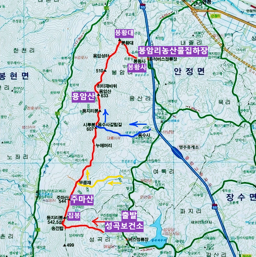 10:10 성곡보건진료소 – 10:39 345kV영주TL187번철탑 – 10:53 주능선/345kV영주TL186번철탑 – 11:09 등지리봉 – 11:21 주마산(11:40 출발) - 12:00 무릎재/봉현지157L33호 – 12:05 호두밭갈림길 – 12:16 누에머리 – 12:24 송이바위 – 12:46 시루봉/거북바위 – 12:51 용수사갈림길 - 12:54 칠형제바위 – 12:58 입맞춤바위 – 12:59 둥지리봉/봉화대 – 13:01 지도상둥지봉 – 13:05 장독바위 – 13:10 정자/여의주바위 – 13:15 용암산 – 13:21 자라바위 – 13:23 새끼자라바위 – 13:29 히티재갈림길 – 13:40 솔바위 – 13:44 반달바위 – 13:47 말바위/봉황대갈림길 – 13:53 고분군 – 14:01 봉암성터 – 14:05 전망대 – 14:13 봉황대 – 14:25 봉황사주차장