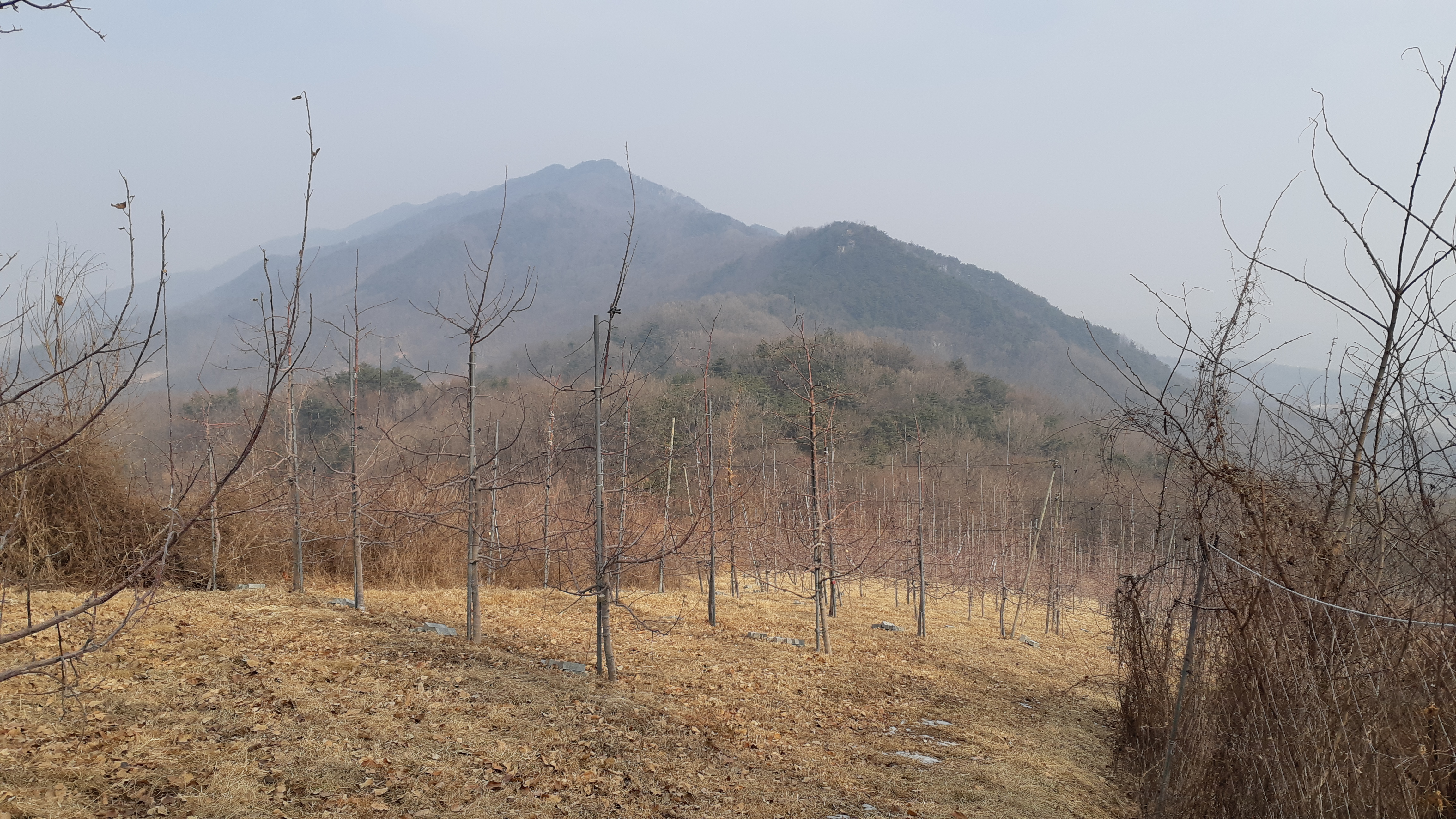 무릎재 내림길 과수원에서 바라본 곧 진행할 누에머리와 뒷쪽은 시루봉이 희미하게나마 조망된다(11:57)