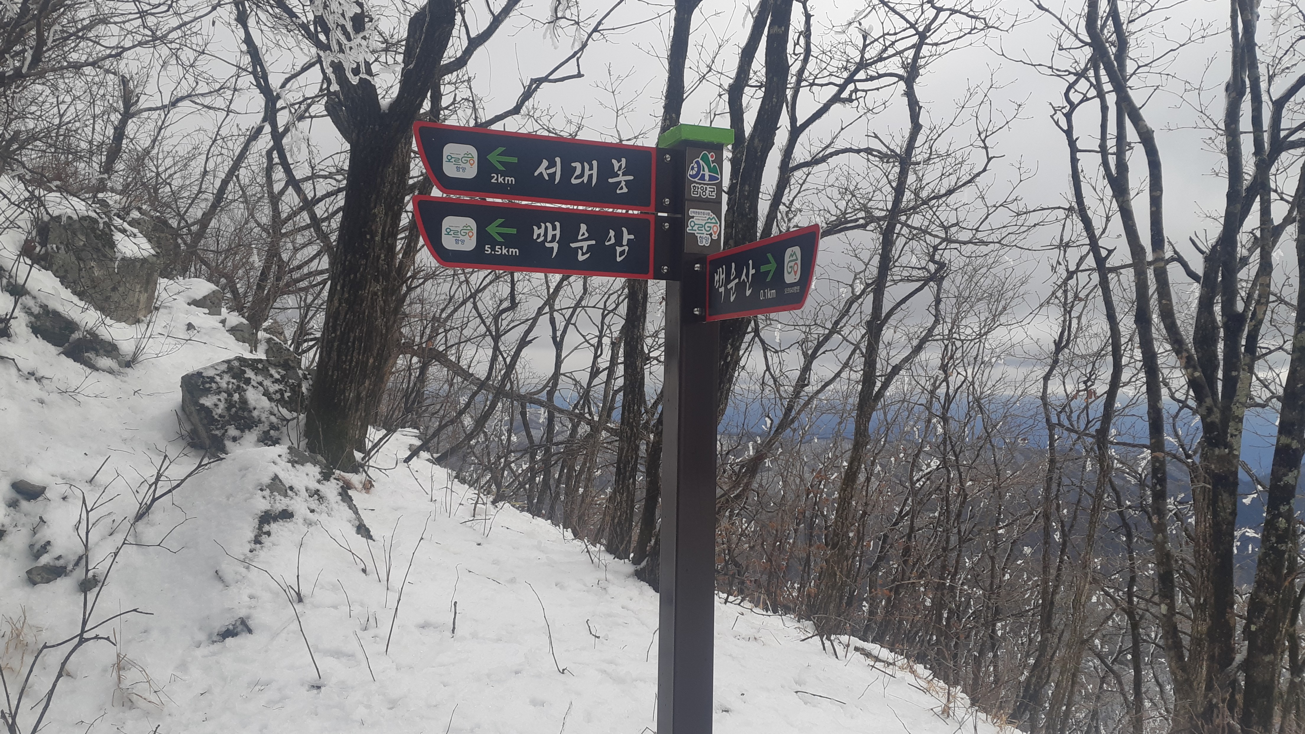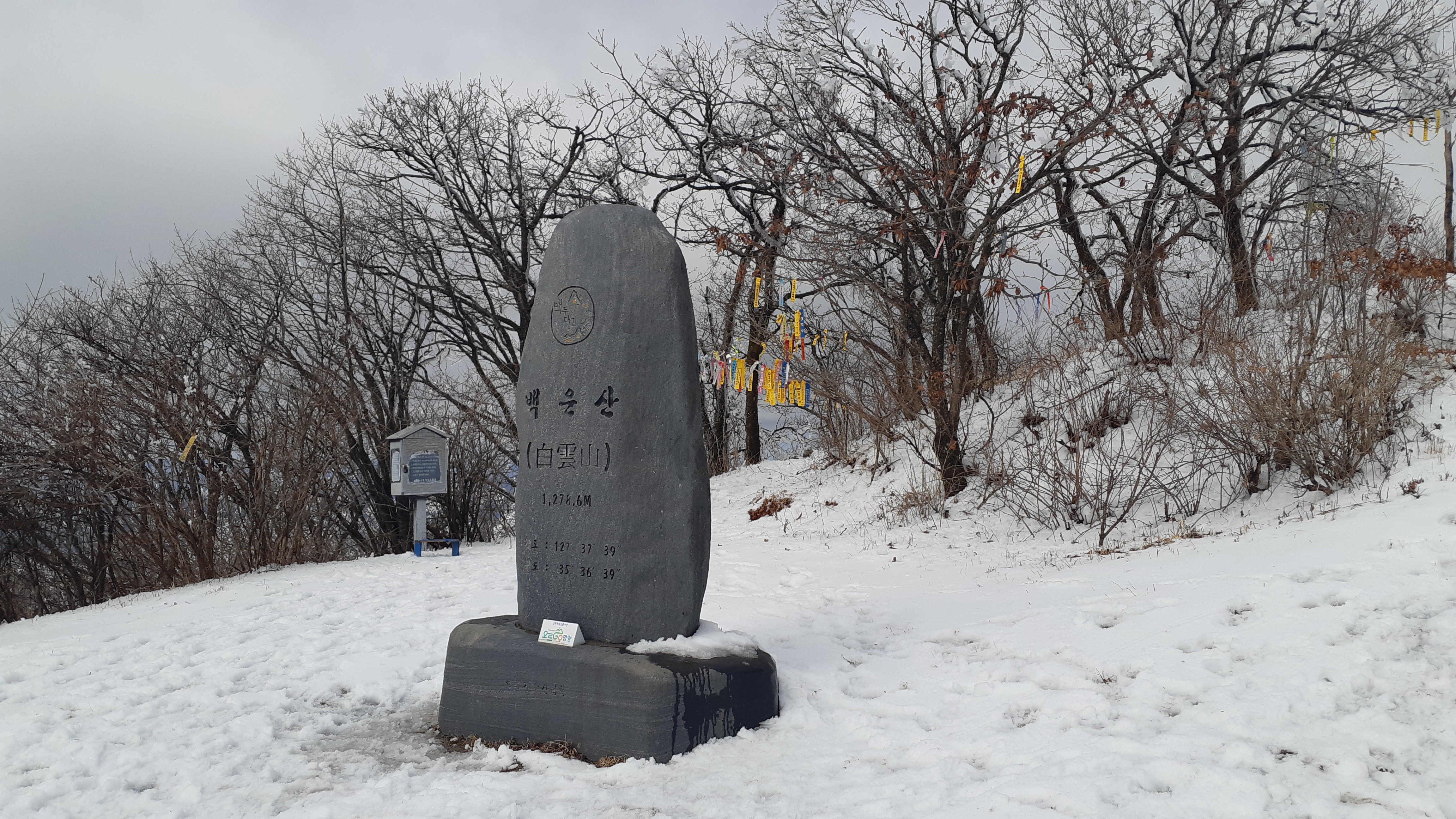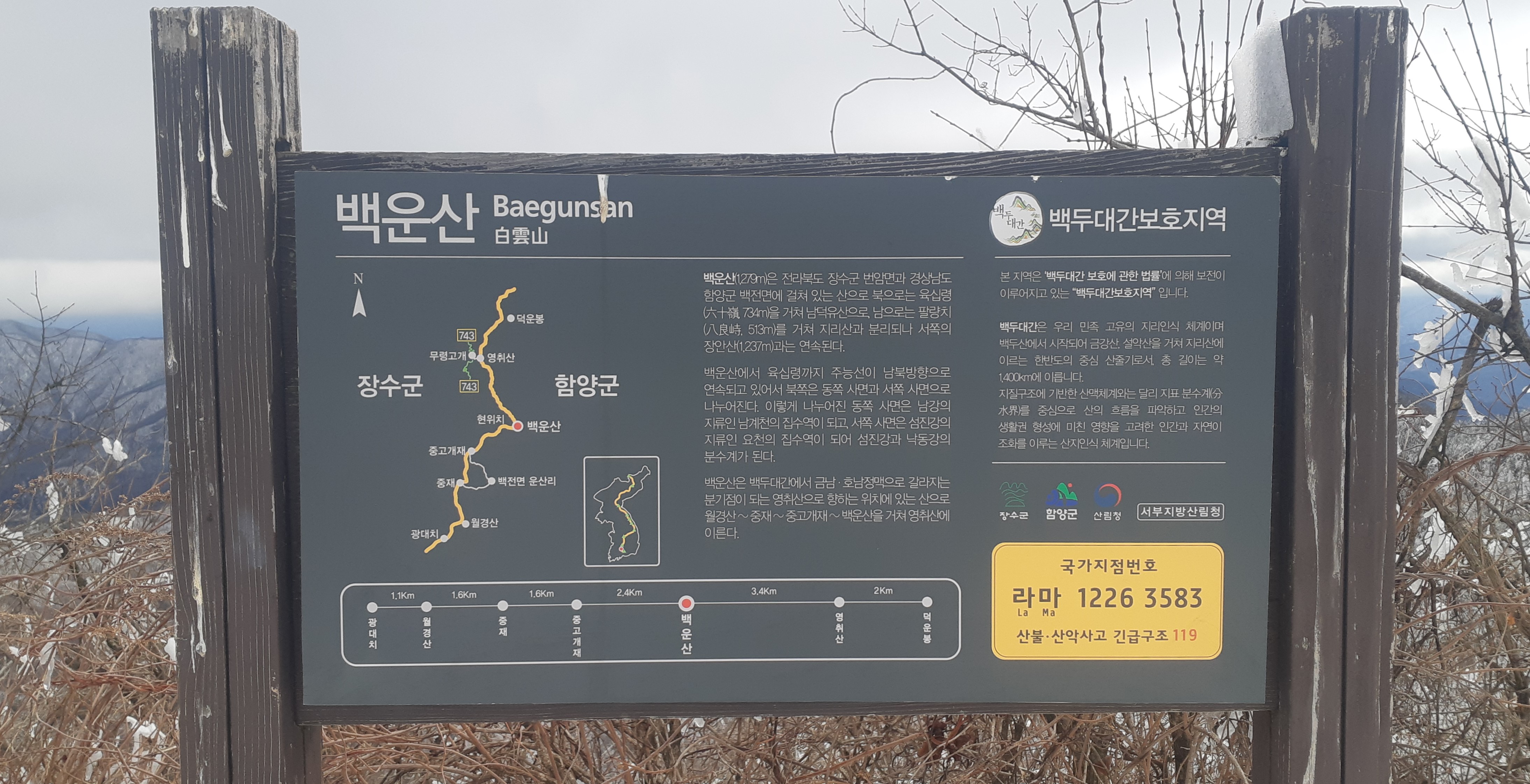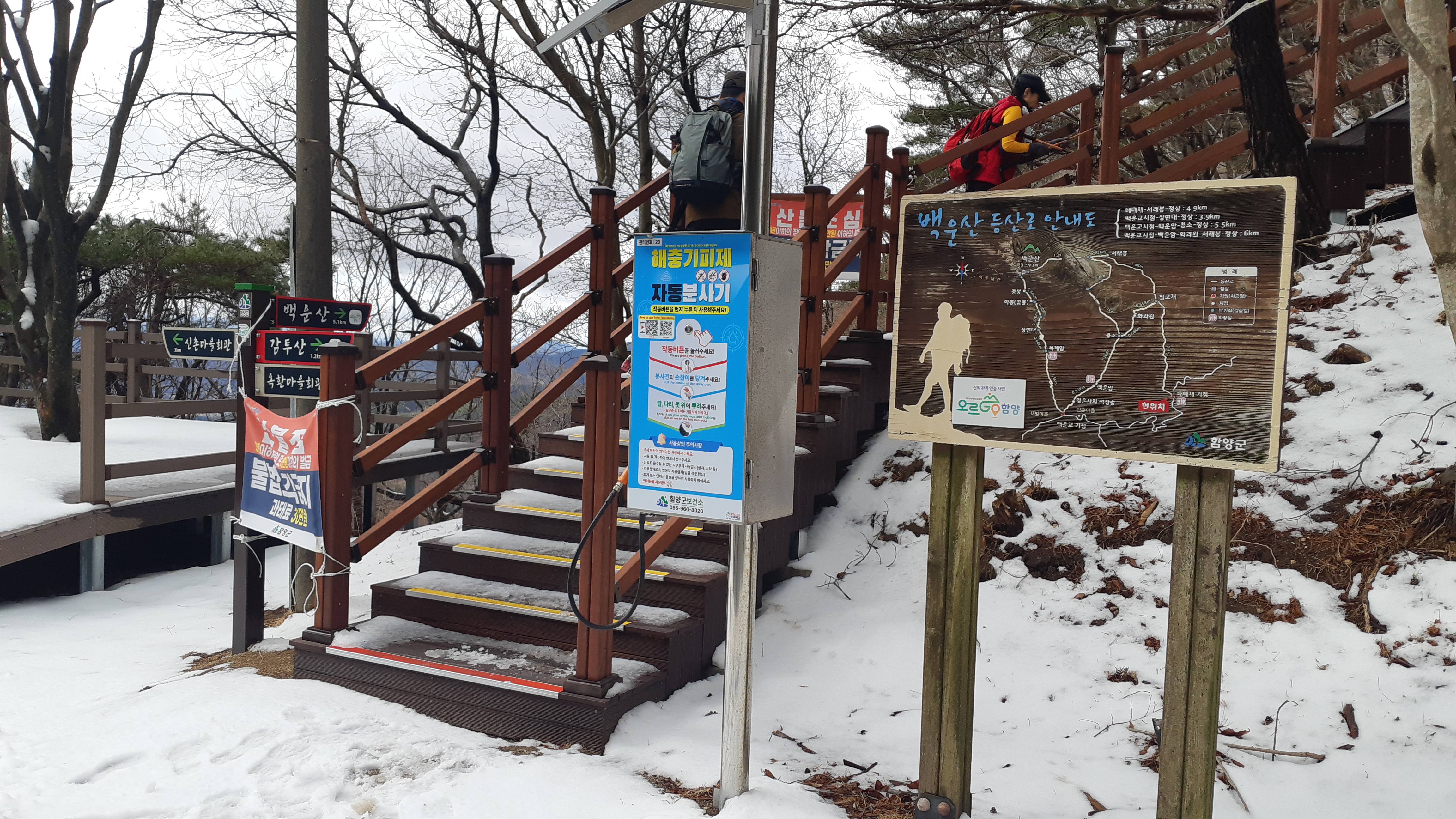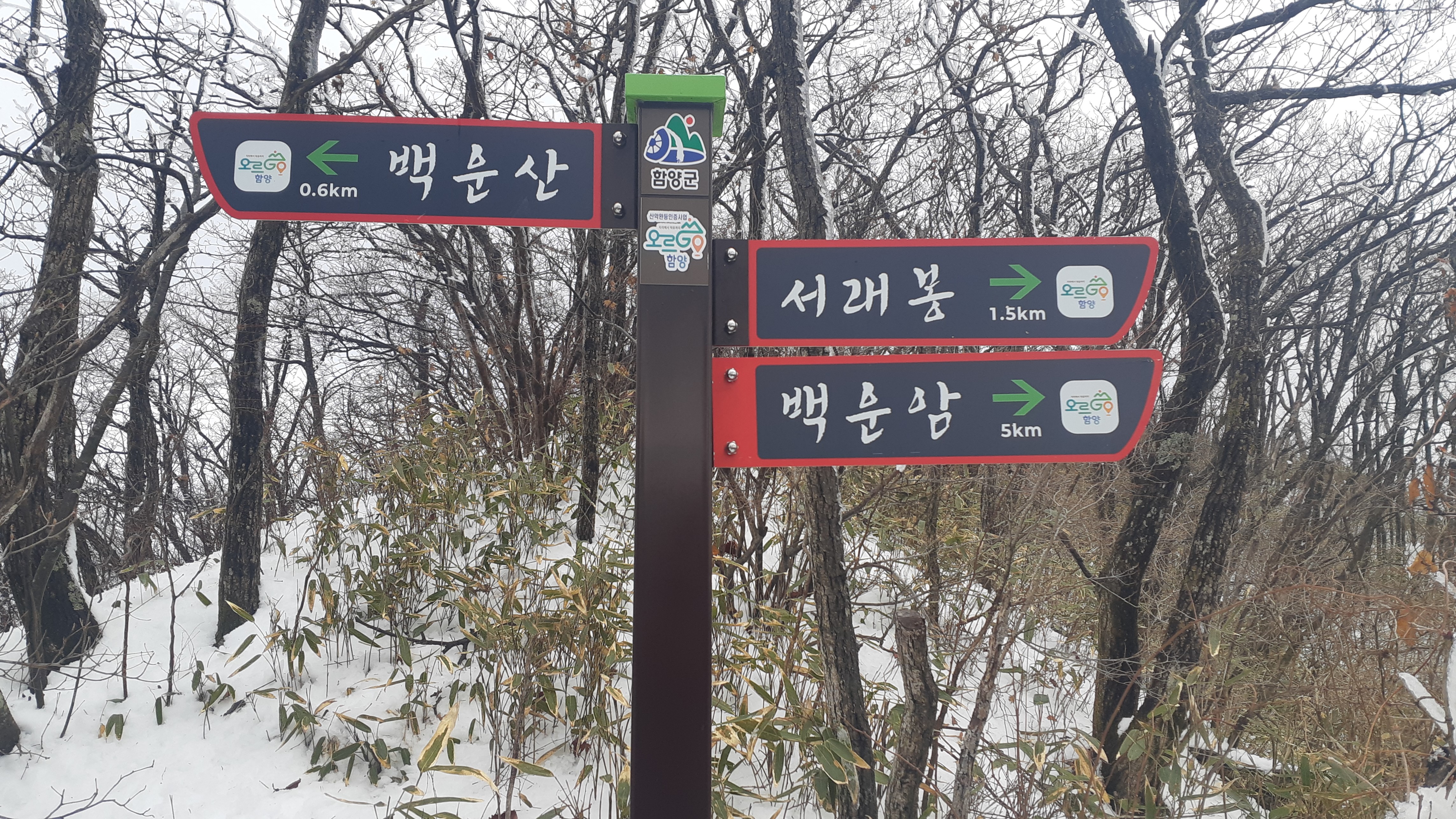 오늘은 참사랑산악회를 따라 경남 함양군과 전북 장수군에 걸쳐있는 백운산과 영취산으로 간다. 오늘 낮 기온이 10여도 가까이 된다고 하니 추위 걱정은 들었지만 어제내린 눈은 조금 조심을 하여야겠다. 부산 동래전철역에서 08시에 출발한 산악회 버스가 함양군 백전면과 서하면 갈림길 고갯마루인 빼빼재에 3시간10분여 걸려 도착한다. 빼빼재에서 오늘 오를 백운산 반대방향의 대봉산과 감투산 그리고 계관봉의 이정표가 보이는데 그곳으로는 2023년3월18일 찾았으니 벌써 3년이나 훌쩍 흘러버렸는데 정말 세월의 빠름은 뒤 돌아보면 저 멀리 달아나 숨어 버린다. 곧장 산행 채비를 갖추고 백전면 청년회에서 건립한 후매령(後梅嶺) 표석 뒤 데크계단을 오르면서 산행을 시작한다.