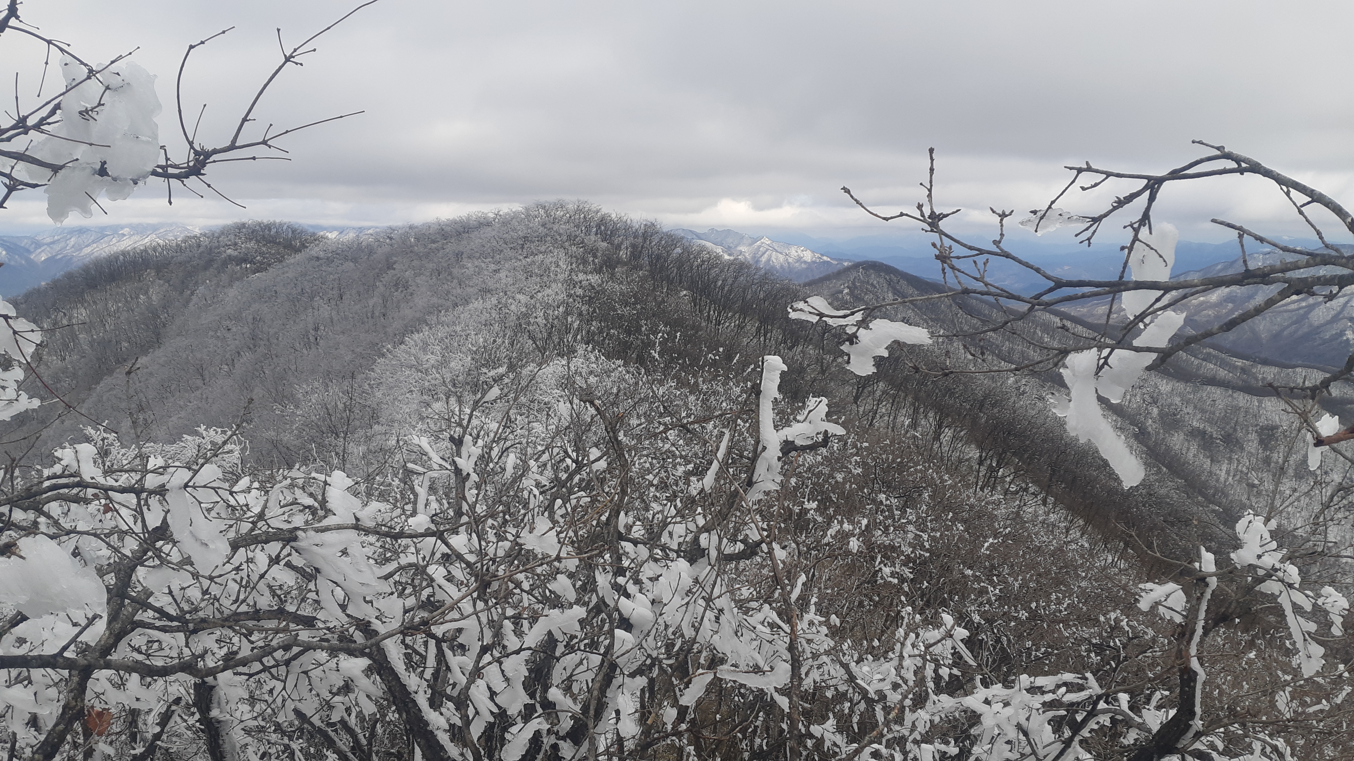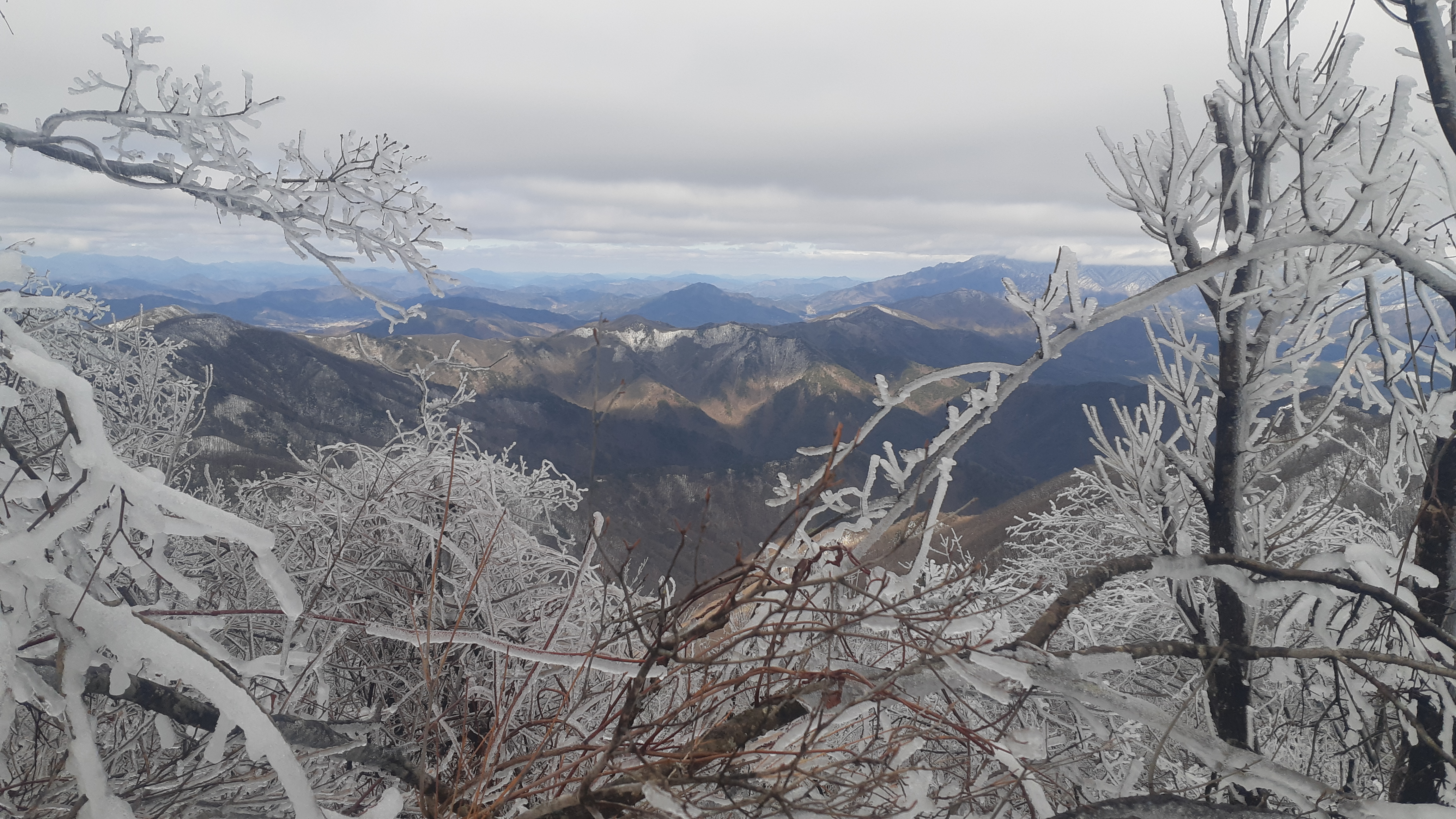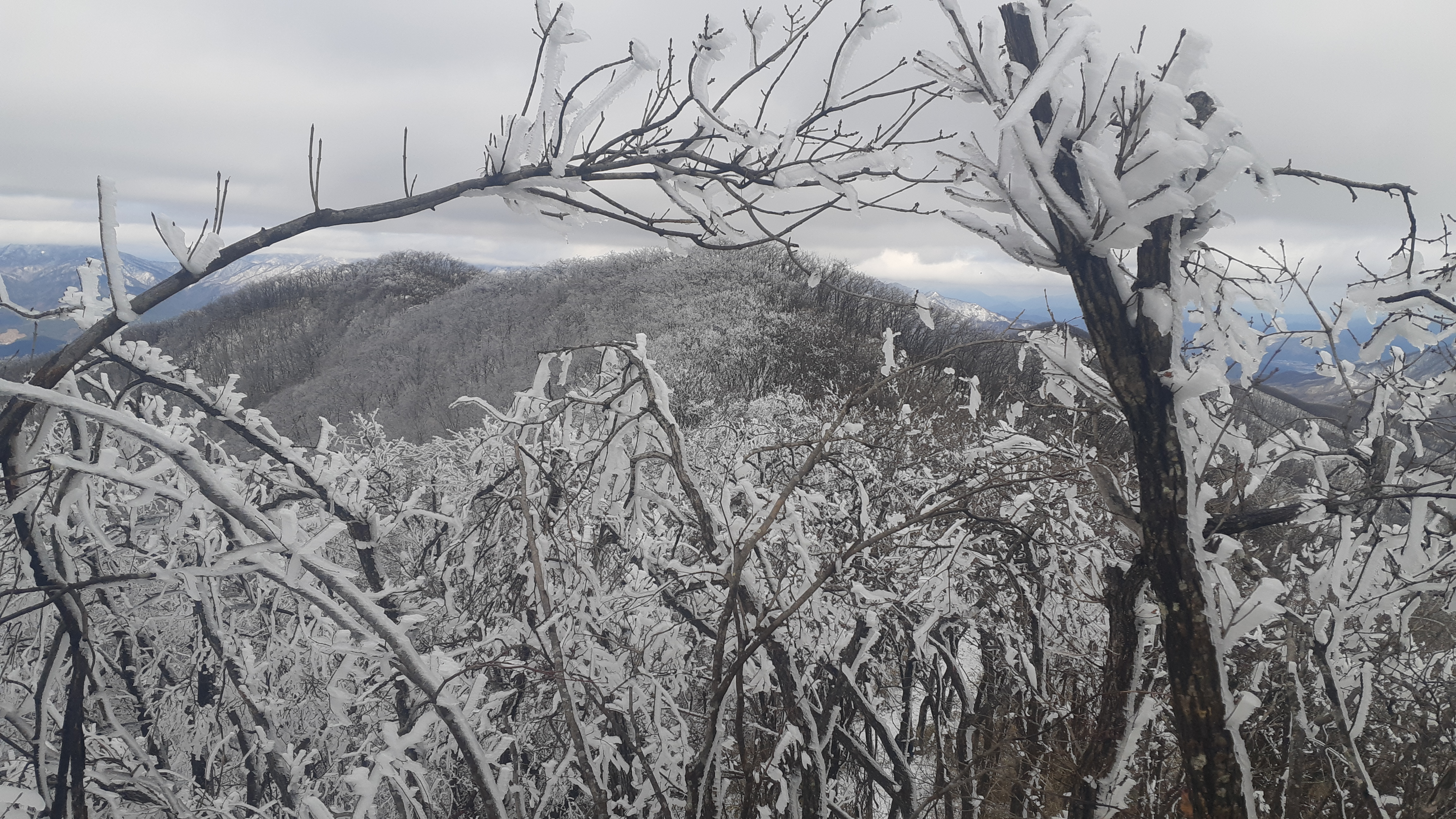 얼음 꽃 사이로 영취산을 지난 백두대간 주능선으로 깃대봉을 지나 육십령을 넘고 할미봉과 덕유서봉으로 이어지는 능선(13:19)