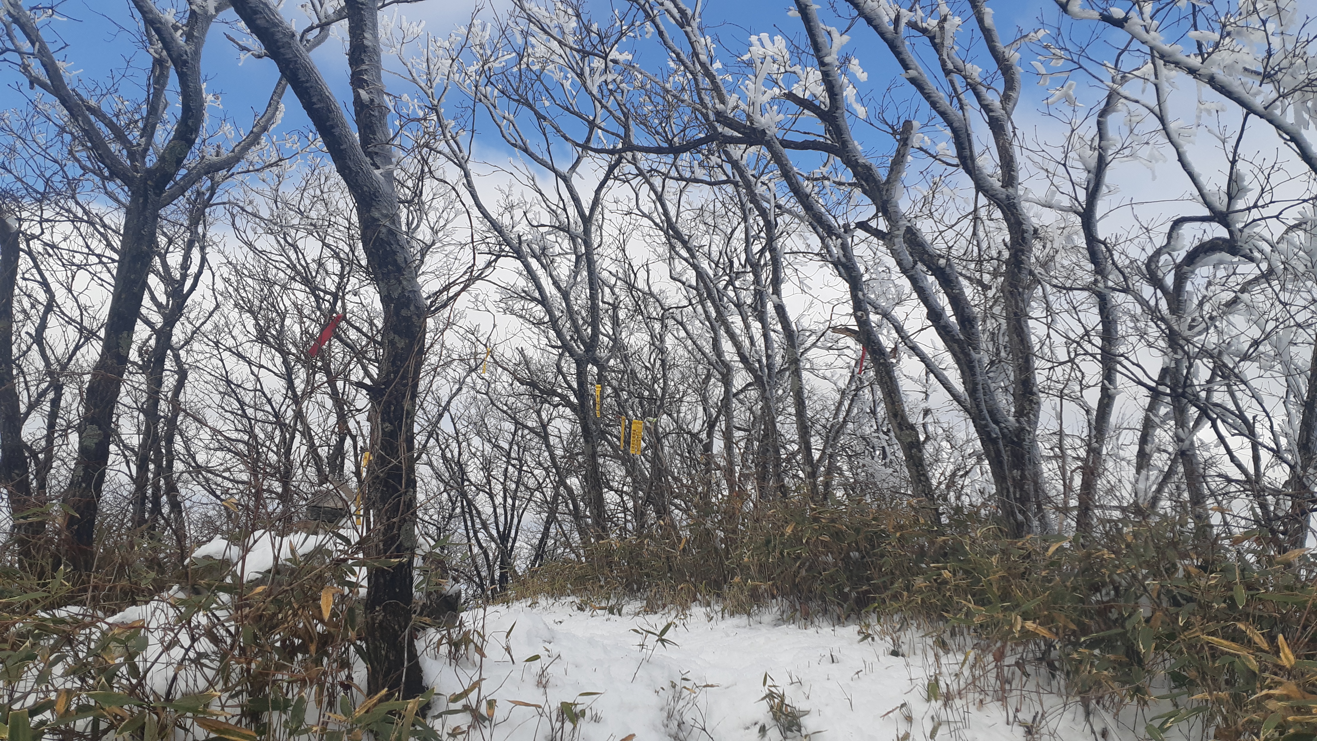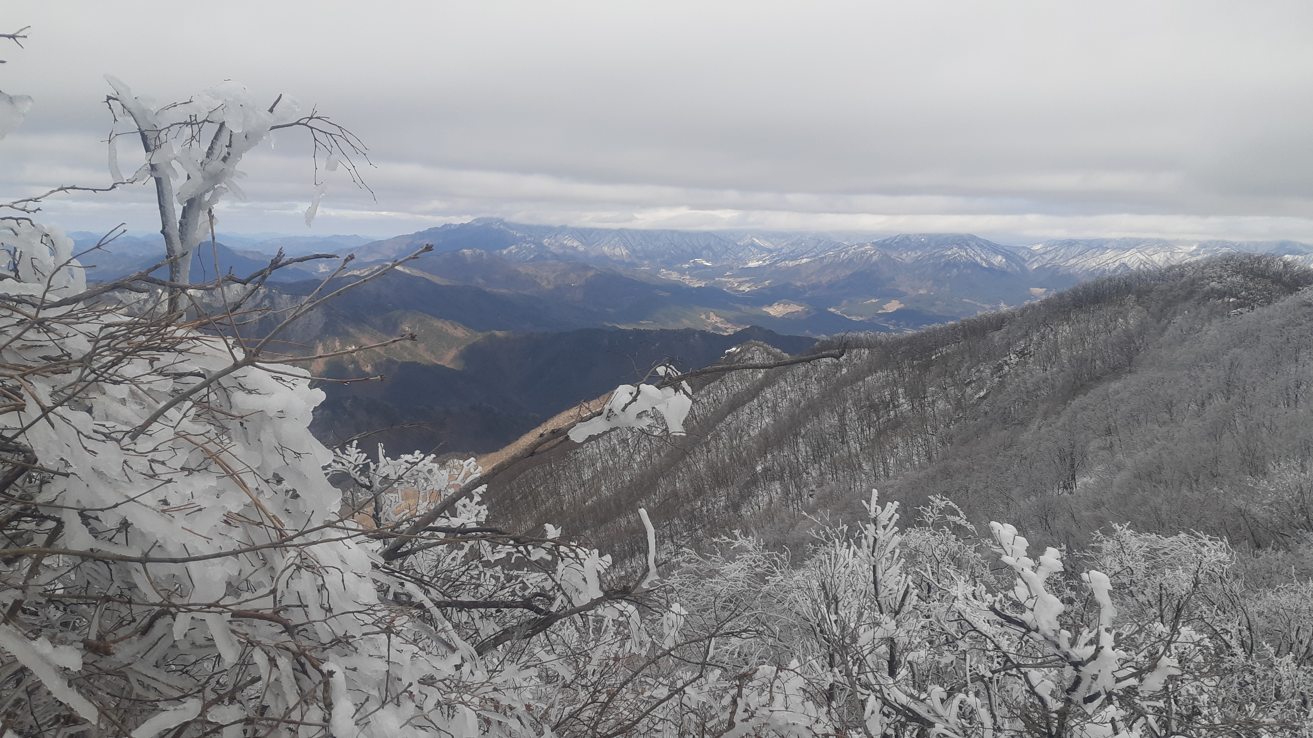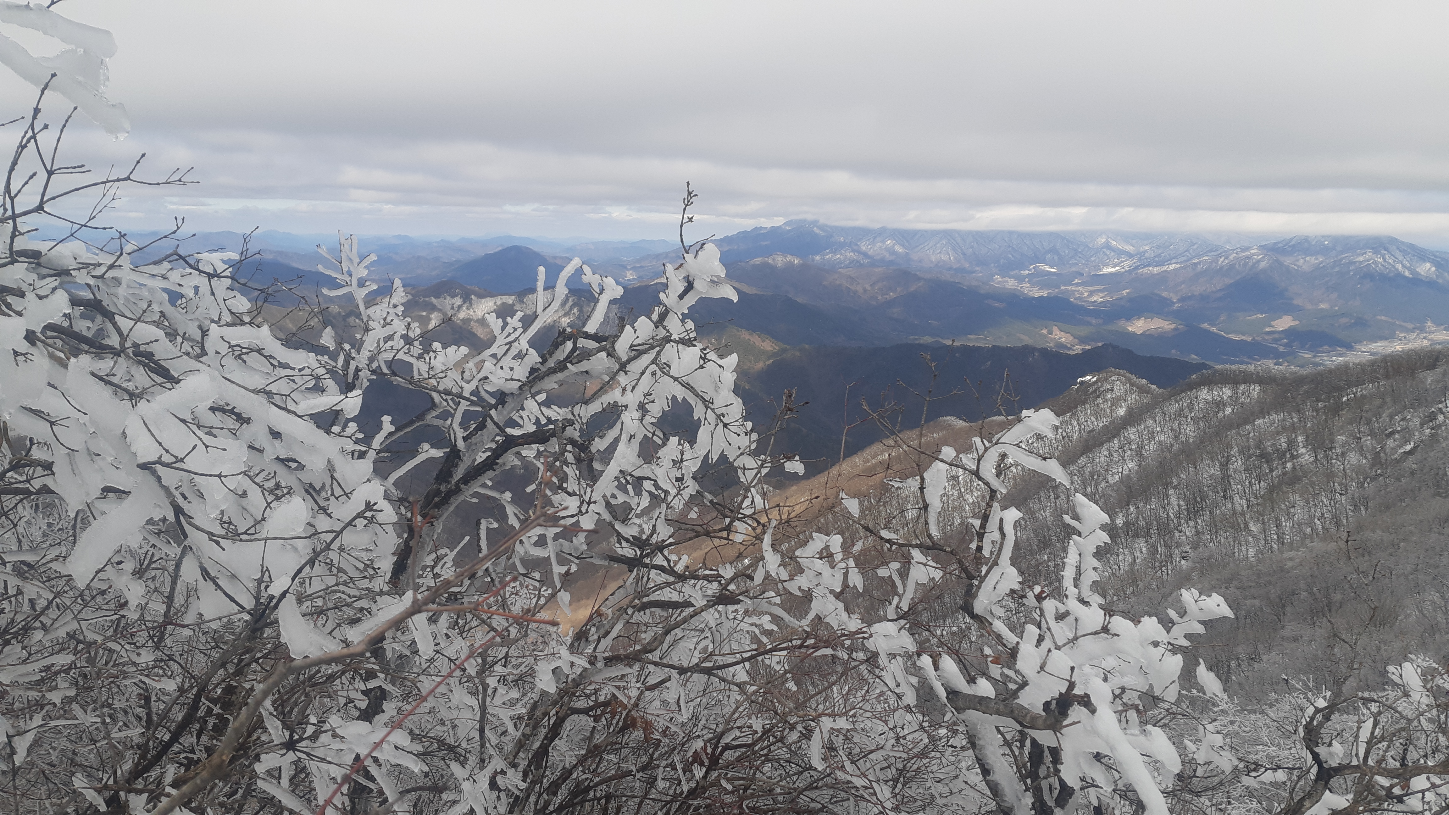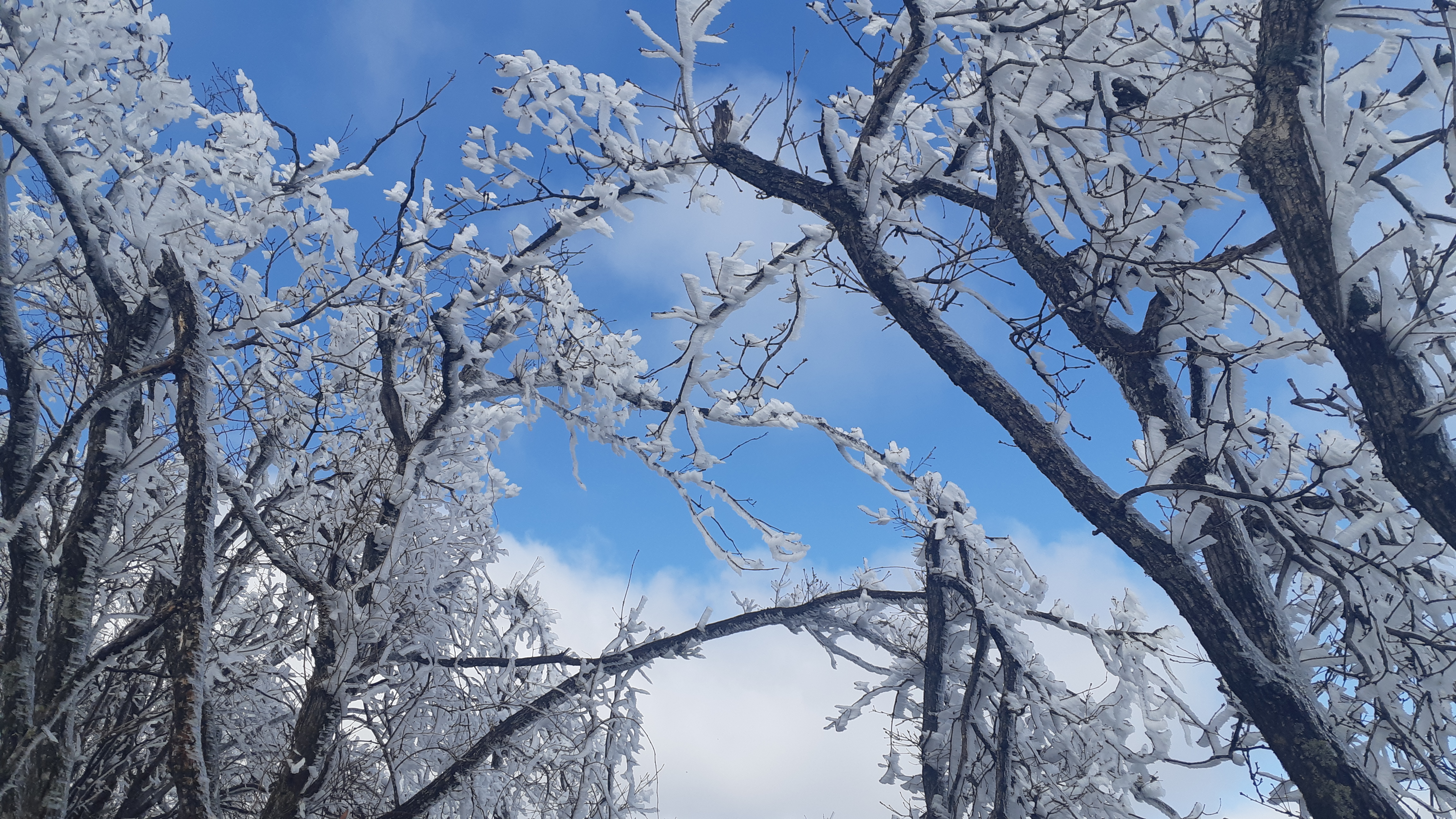 얼음 꽃 사이로 영취산을 지난 백두대간 주능선으로 깃대봉을 지나 육십령을 넘고 할미봉과 덕유서봉으로 이어지는 능선(13:19)