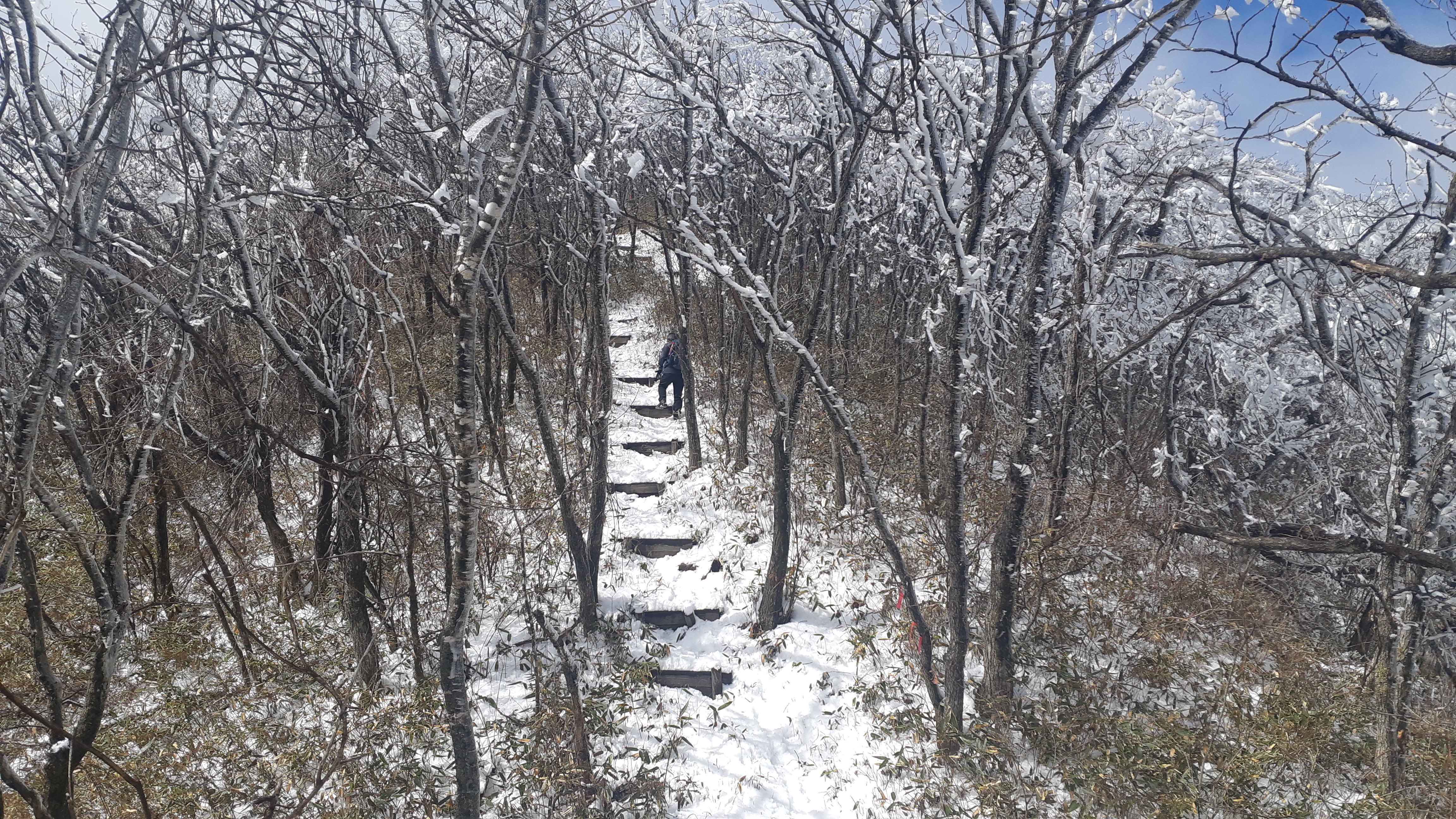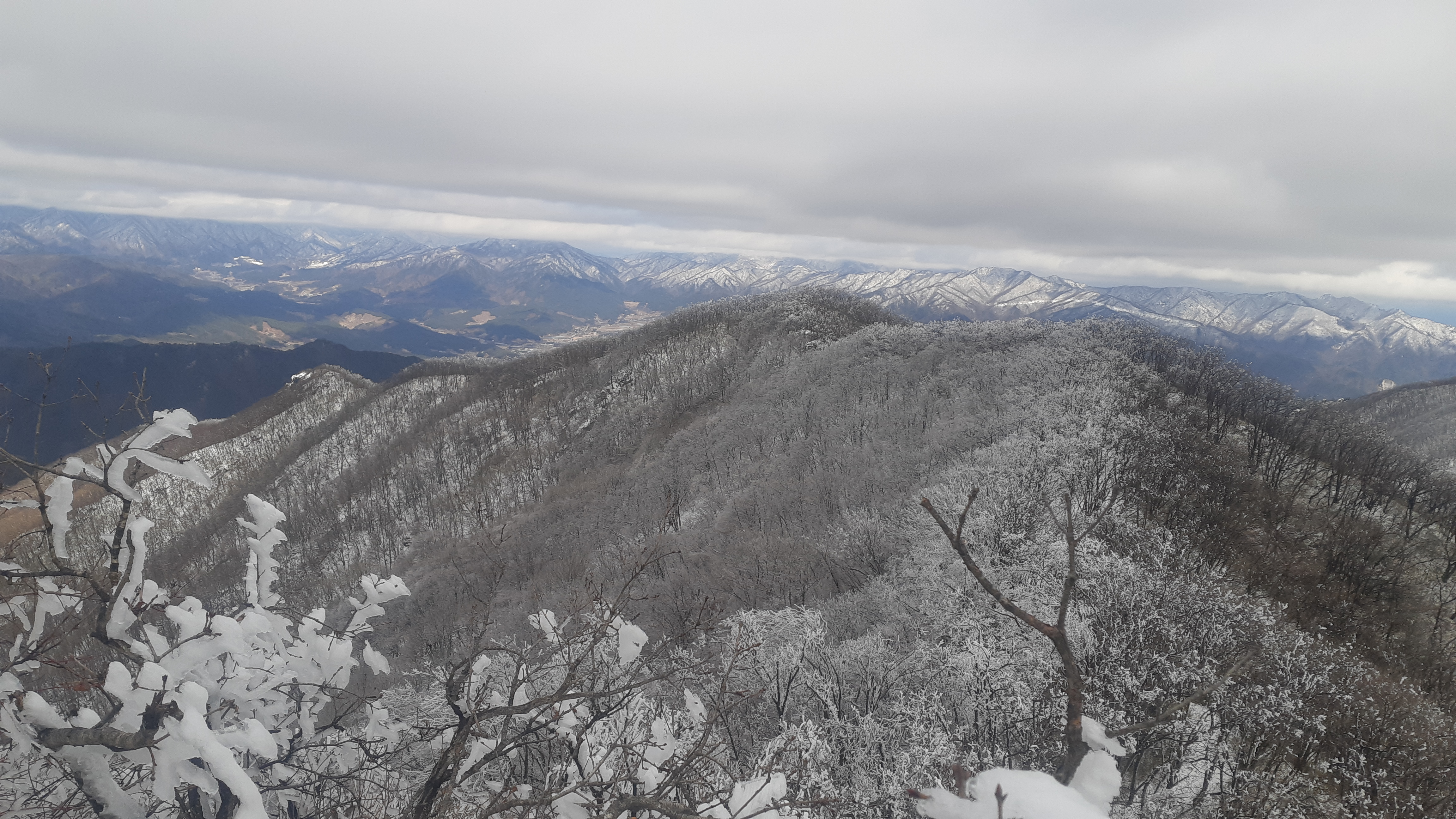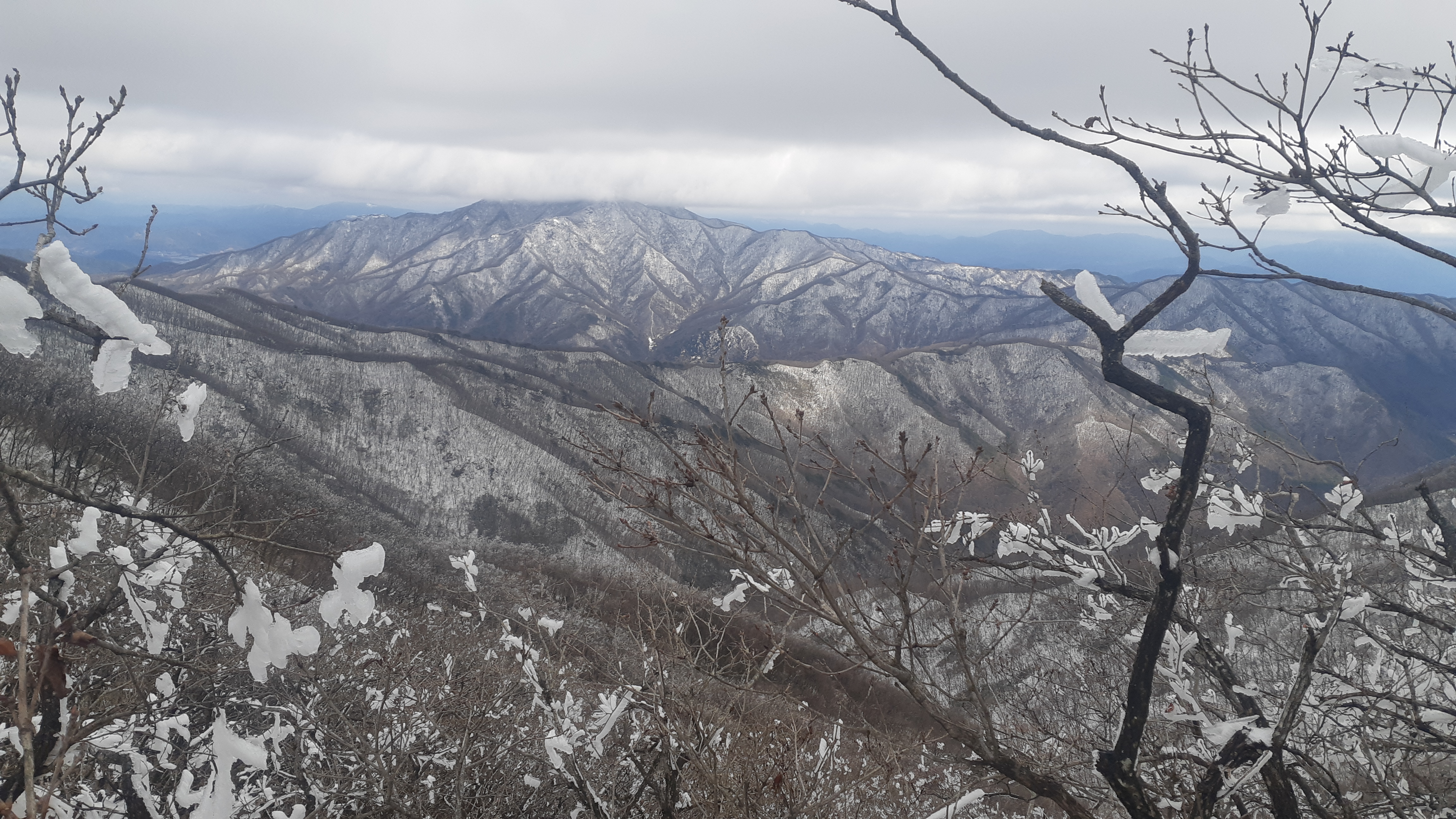 가파른 데크계단을 오르고 조금 진행하다 아이젠을 꺼내 눈길 산행에 대비를 한다. 아이젠을 착용하면 발의 무게는 약간 무겁지만 미끄러지지 않으려고 장단지에 힘을 많이 주는 것 보다는 훨씬 편리하게 걸을 수가 있다. 고도를 높이면서 30여분 진행하니 동북 방향으로 금원산에서 거망산과 황석산으로 이어지는 산 그림이 펼쳐지는데 장관(壯觀)을 이루고, 건너편으로는 감투산에서 대봉산으로 이어지는 능선 모습도 훌륭하다. 하지만 나뭇가지와 껍질에 밤사이 얼어 붙어있는 얼음 알갱이들이 기온이 올라가니 한꺼번에 후드득 떨어지는데 주의를 기울여야만 하는 현실이다.