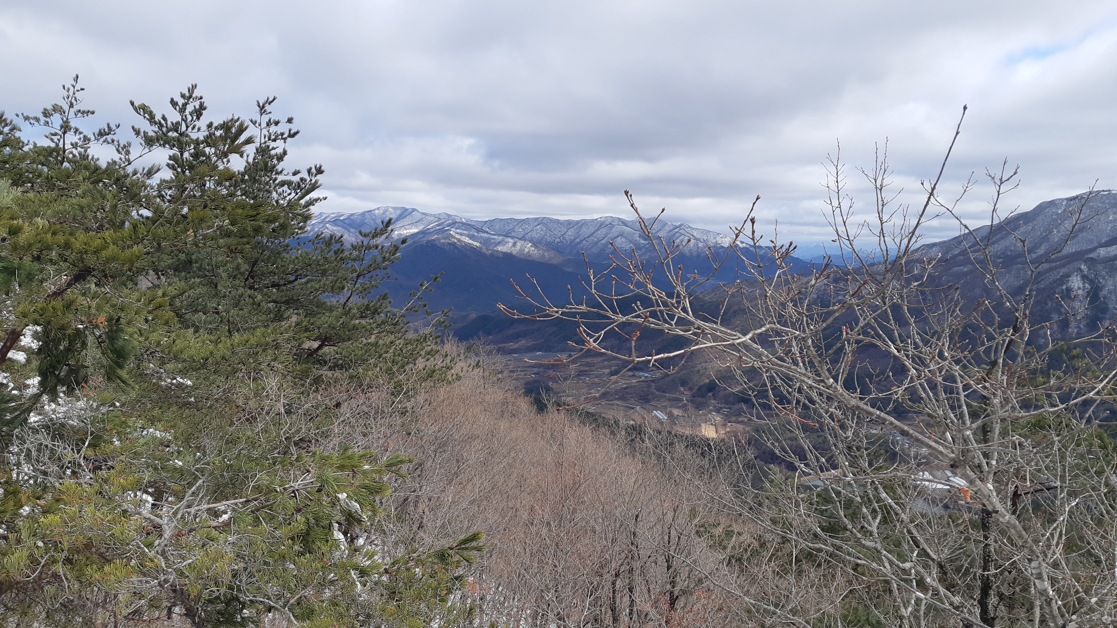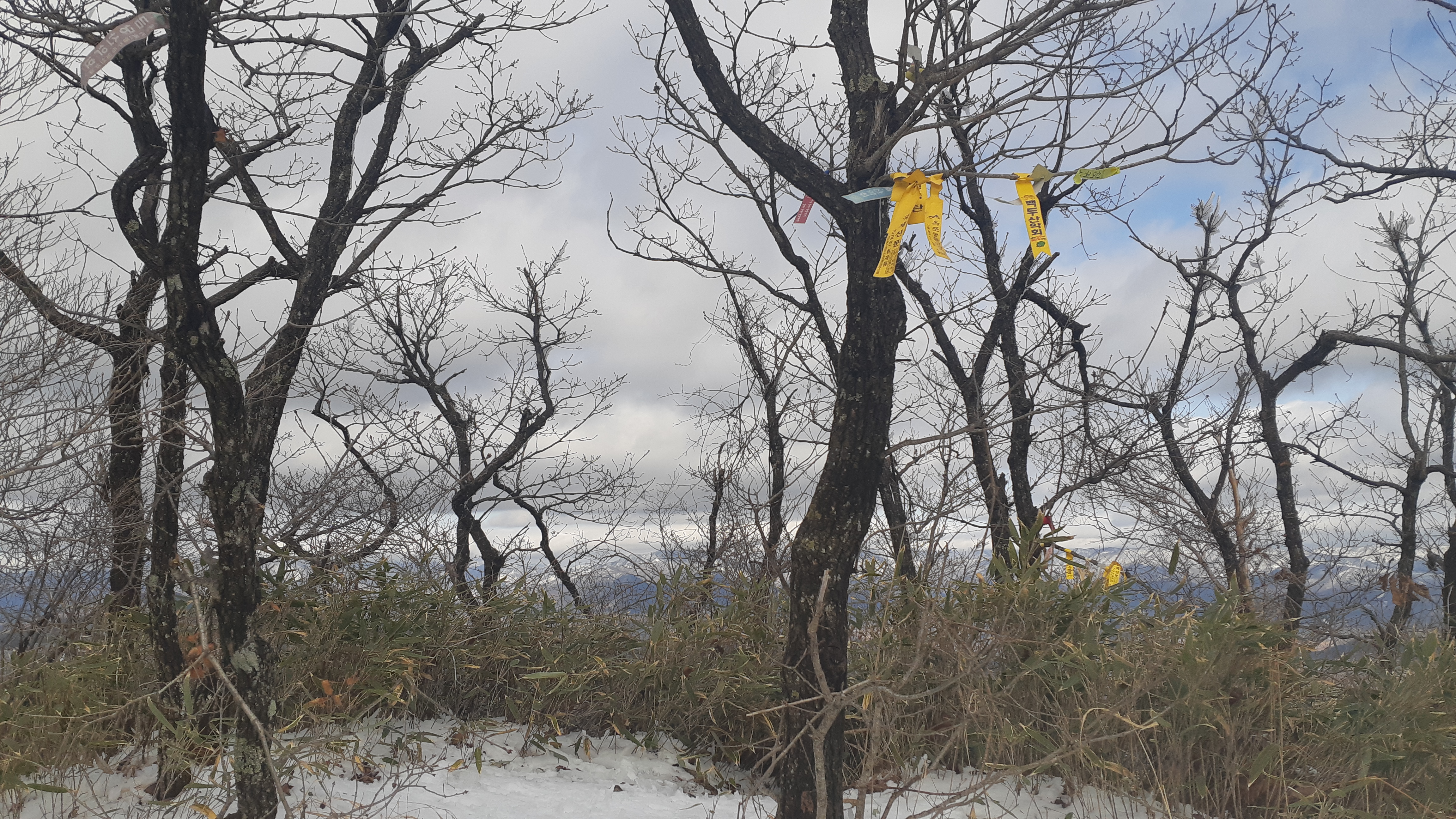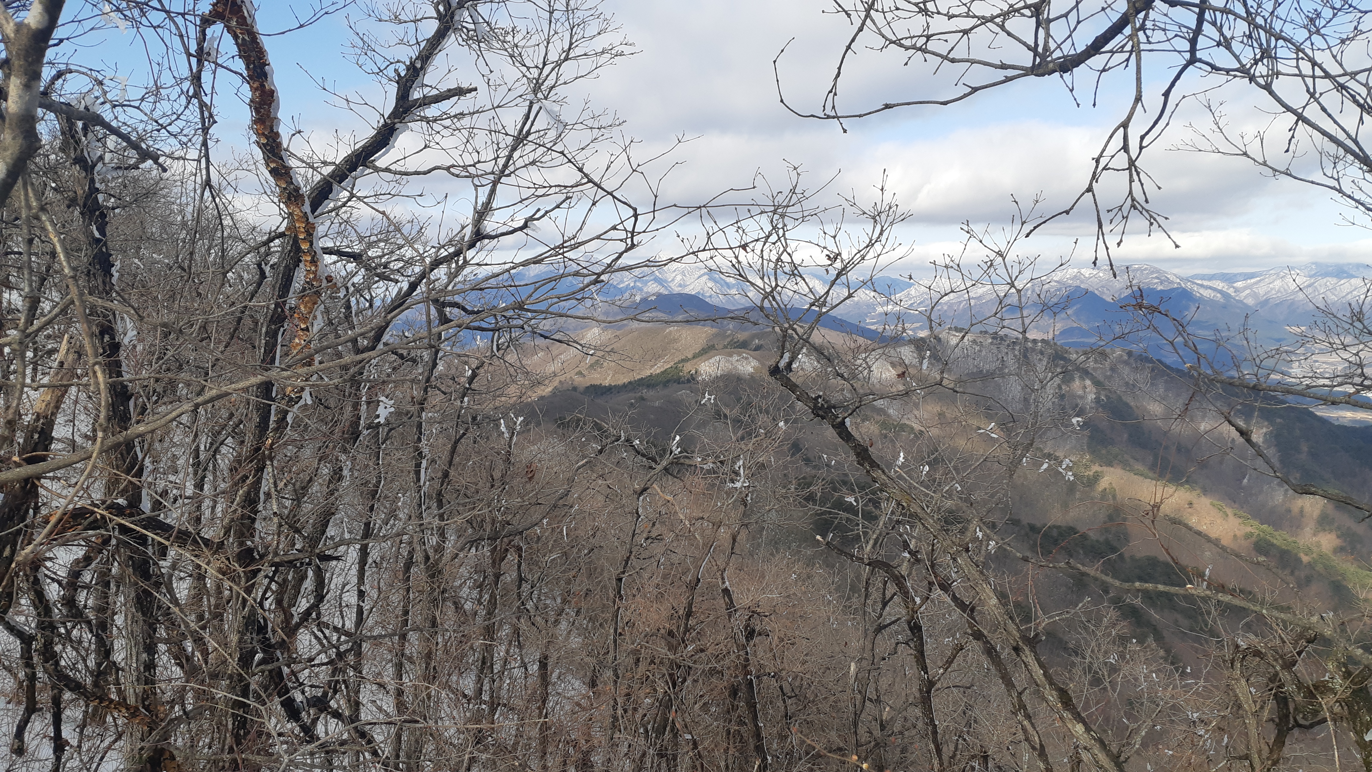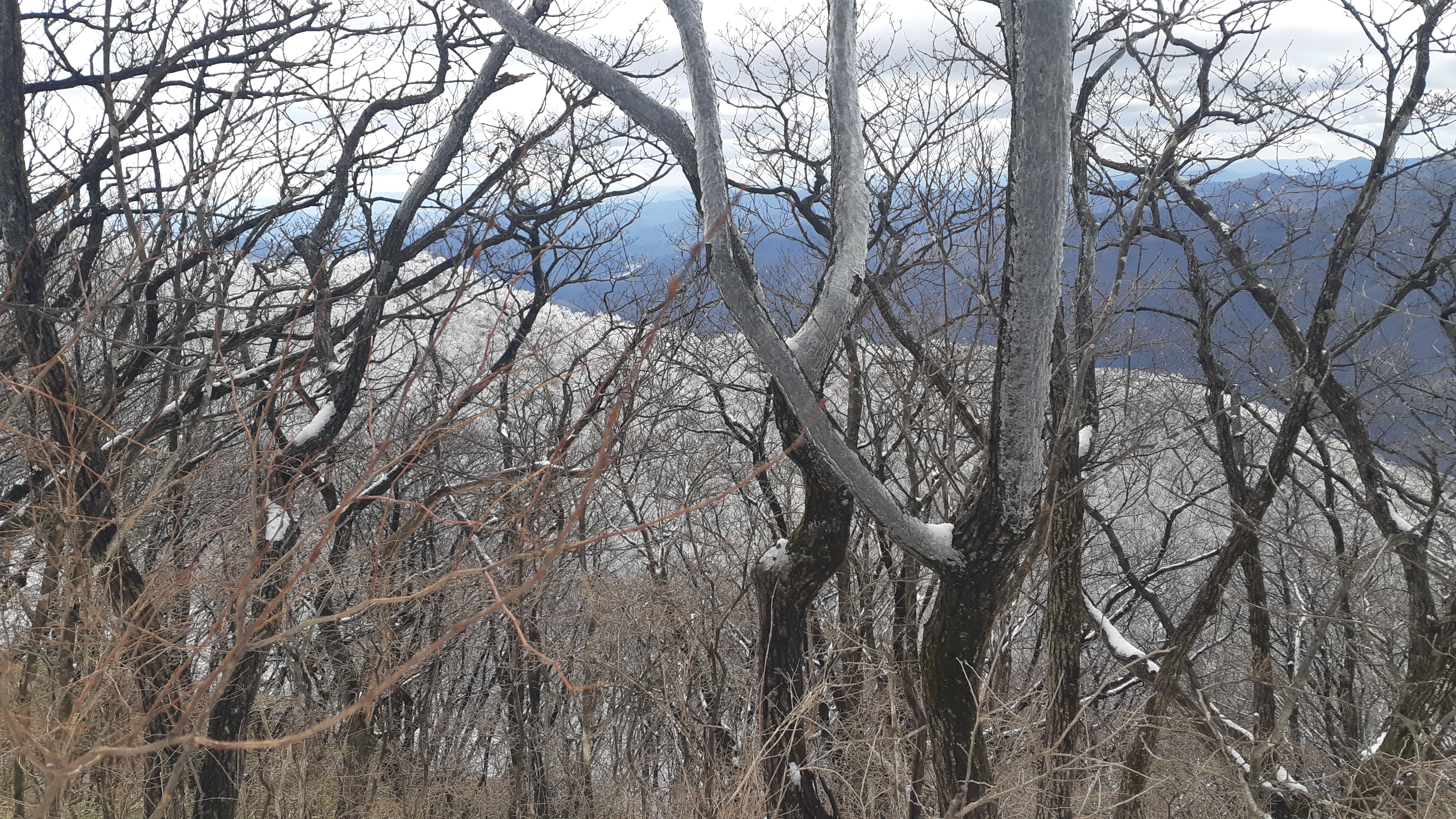 가파른 데크계단을 오르고 조금 진행하다 아이젠을 꺼내 눈길 산행에 대비를 한다. 아이젠을 착용하면 발의 무게는 약간 무겁지만 미끄러지지 않으려고 장단지에 힘을 많이 주는 것 보다는 훨씬 편리하게 걸을 수가 있다. 고도를 높이면서 30여분 진행하니 동북 방향으로 금원산에서 거망산과 황석산으로 이어지는 산 그림이 펼쳐지는데 장관(壯觀)을 이루고, 건너편으로는 감투산에서 대봉산으로 이어지는 능선 모습도 훌륭하다. 하지만 나뭇가지와 껍질에 밤사이 얼어 붙어있는 얼음 알갱이들이 기온이 올라가니 한꺼번에 후드득 떨어지는데 주의를 기울여야만 하는 현실이다.