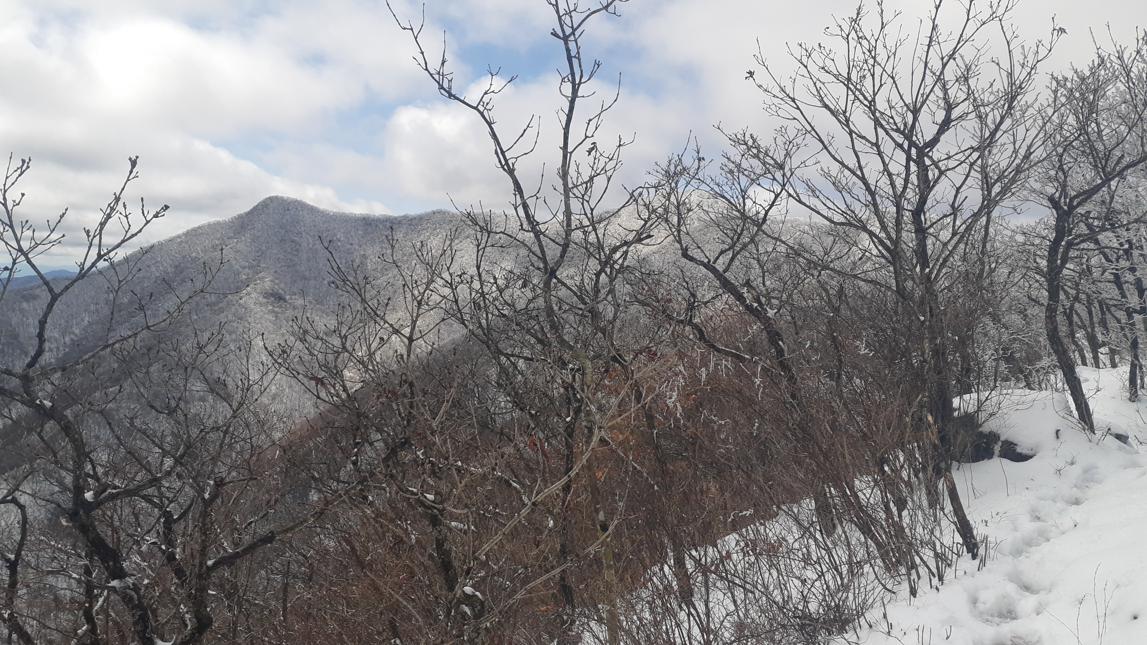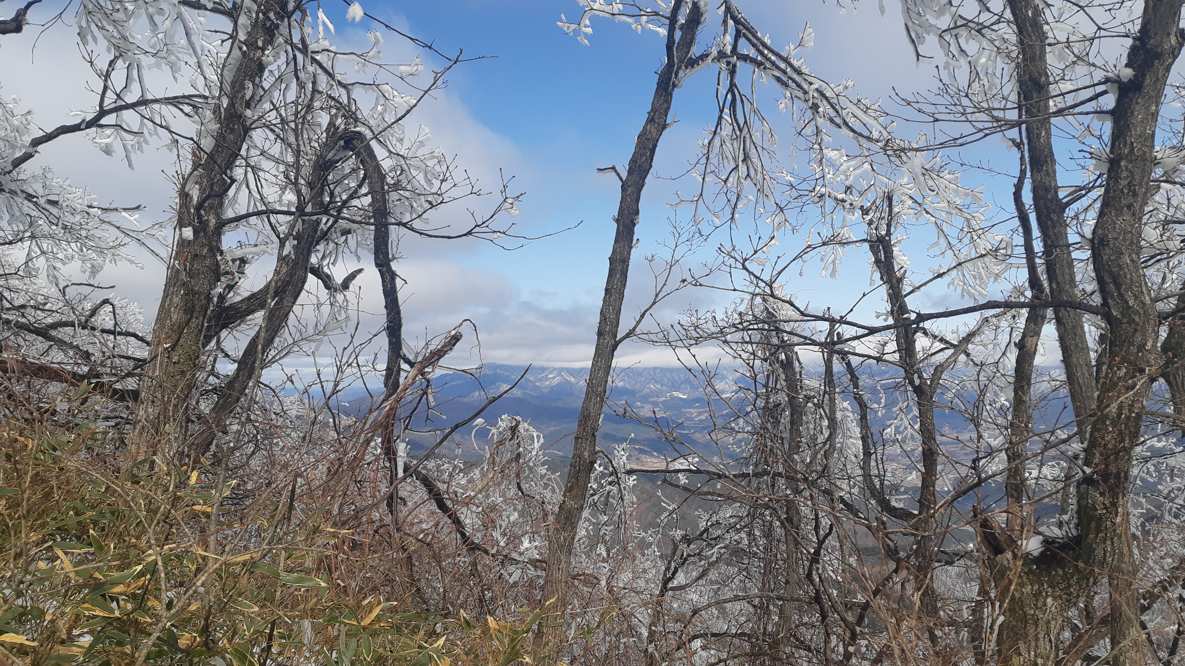 얼음 꽃 사이에는 덕유 서봉과 남덕유가 구름에 가려져있다(12:26)