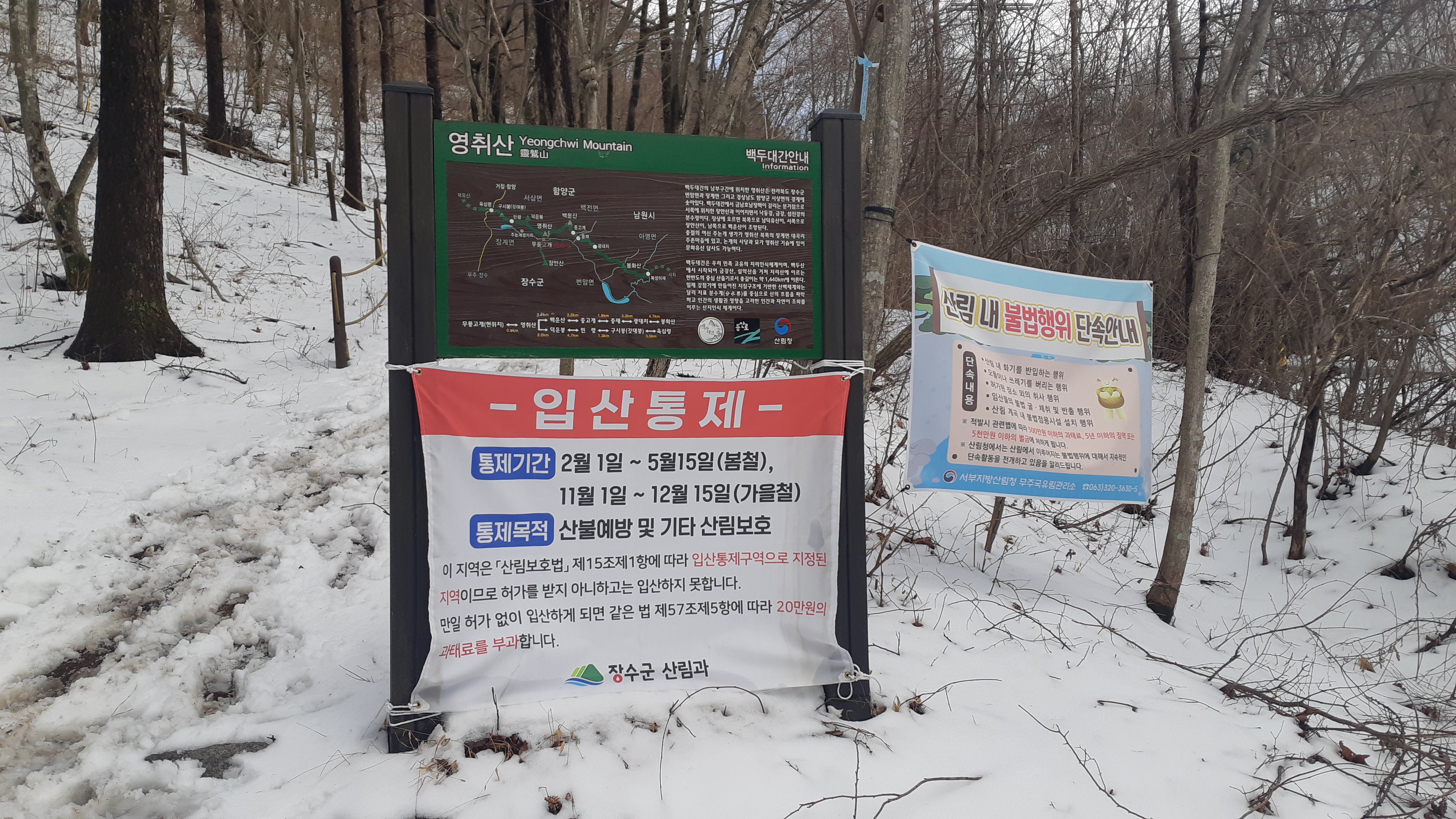 산죽 길과 쉼터를 지나 영취산에 닿고 곧장 무룡고개로 내려선다. 2005년1월22일 금남.호남정맥 종주시 다녀간 길이다. 무룡고개에 내려서고 왼쪽 터널을 지나 장수군 번암면의 틔움·장수 산림 신품종 재배단지입구에 주차된 차량에 도착하면서 오늘 산행을 마무리한다. 후미가 도착하고 경남 함안군 군북면 월촌리 예촌한식뷔페로 이동 정월대보름 나물 반찬으로 반주를 곁들인 식사 후 부산으로 향한다.