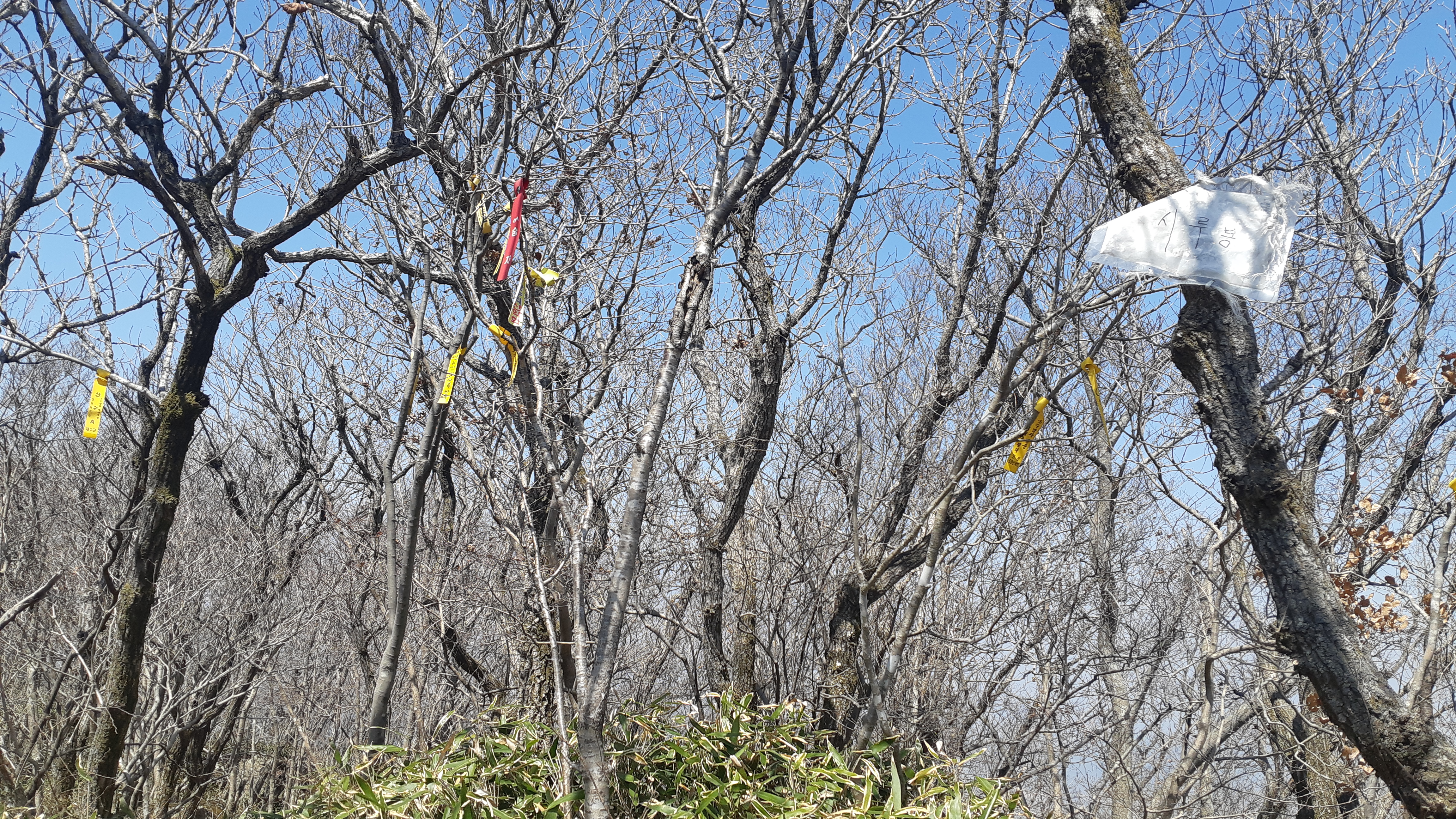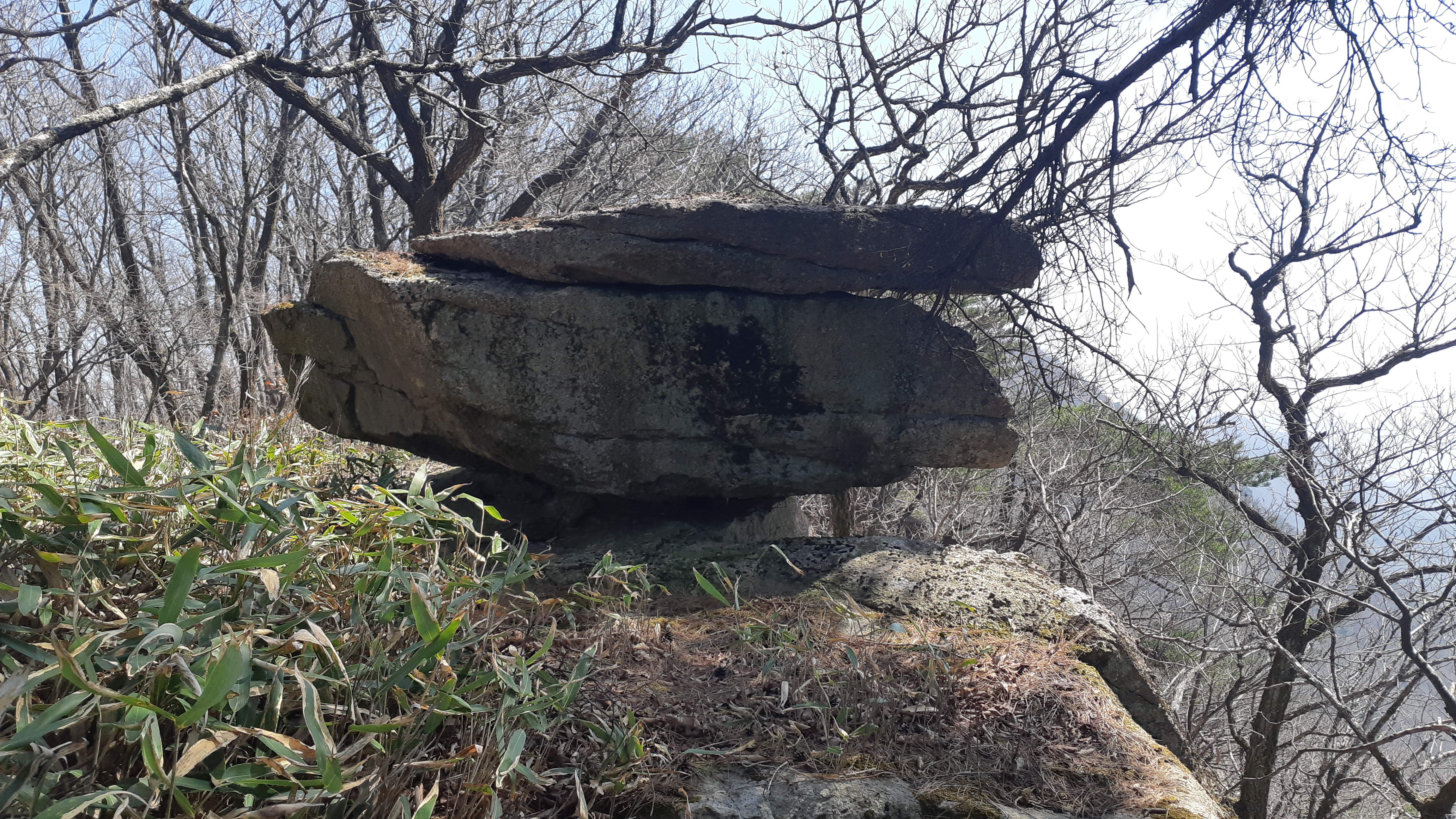 장성갈재를 출발한 뒤 1시간30여분 걸려 암릉을 왼쪽으로 우회하여 시루봉정상에 무사히 도착하였다. 10년 전 시루봉에서 장설갈재로 내려가는 산길을 바로 찾지 못한 이유를 알 수가 있었다. 시루봉 정상에는 정상석도 없거니와 주위는 잡목에 가려 조망 또한 시원치 않은 곳이라 곧장 영산기맥 갈림길에서 오른쪽 장자봉으로 꺾어 내려서다 바위 위에서 점심식사(12:29~12:40)를 하고 출발한다.