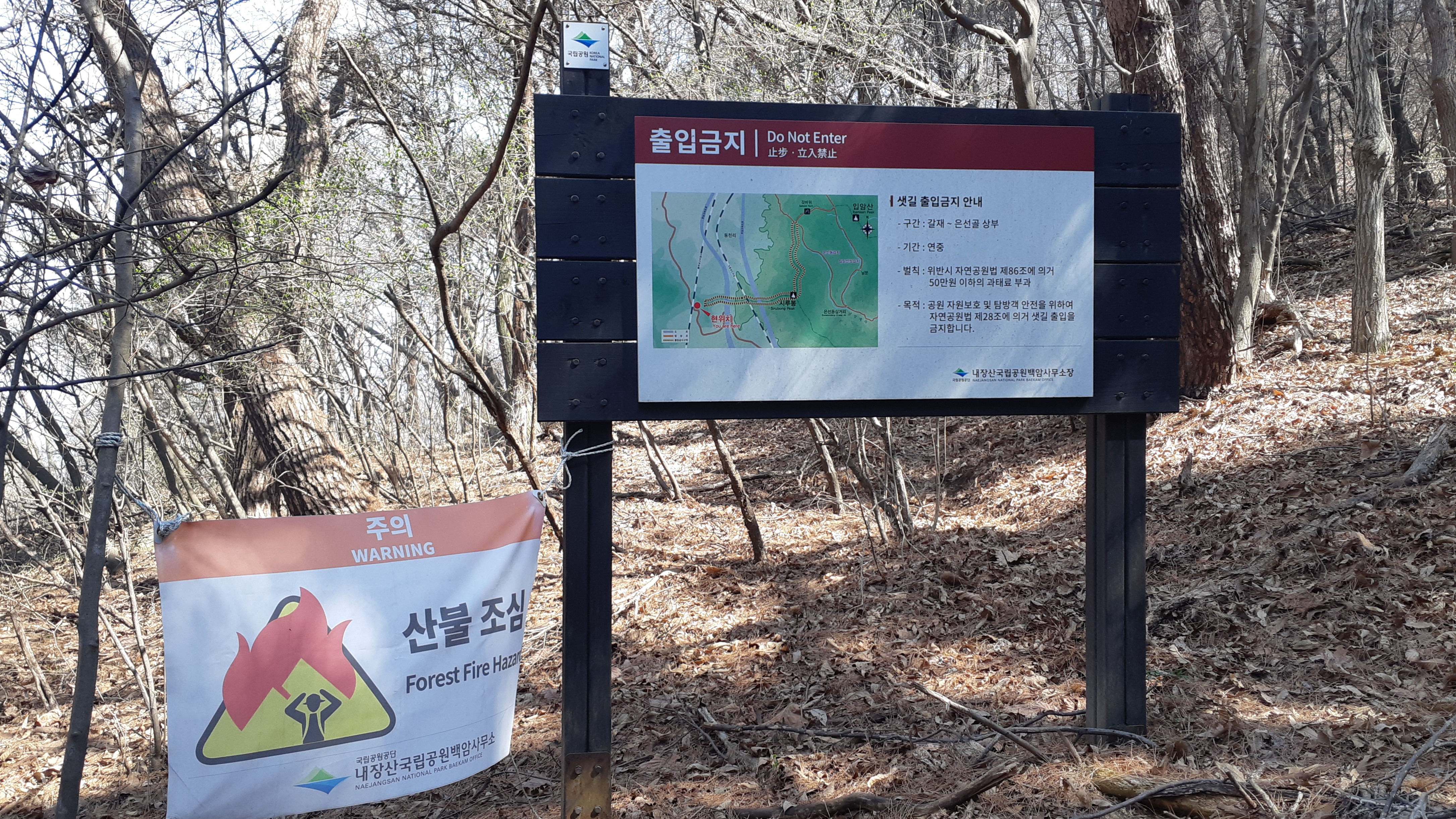 오늘 산행은 내장산국립공원의 비탐방 지역에서 시작된다/기한도 없는 출입금지 표지판이다(11:00)