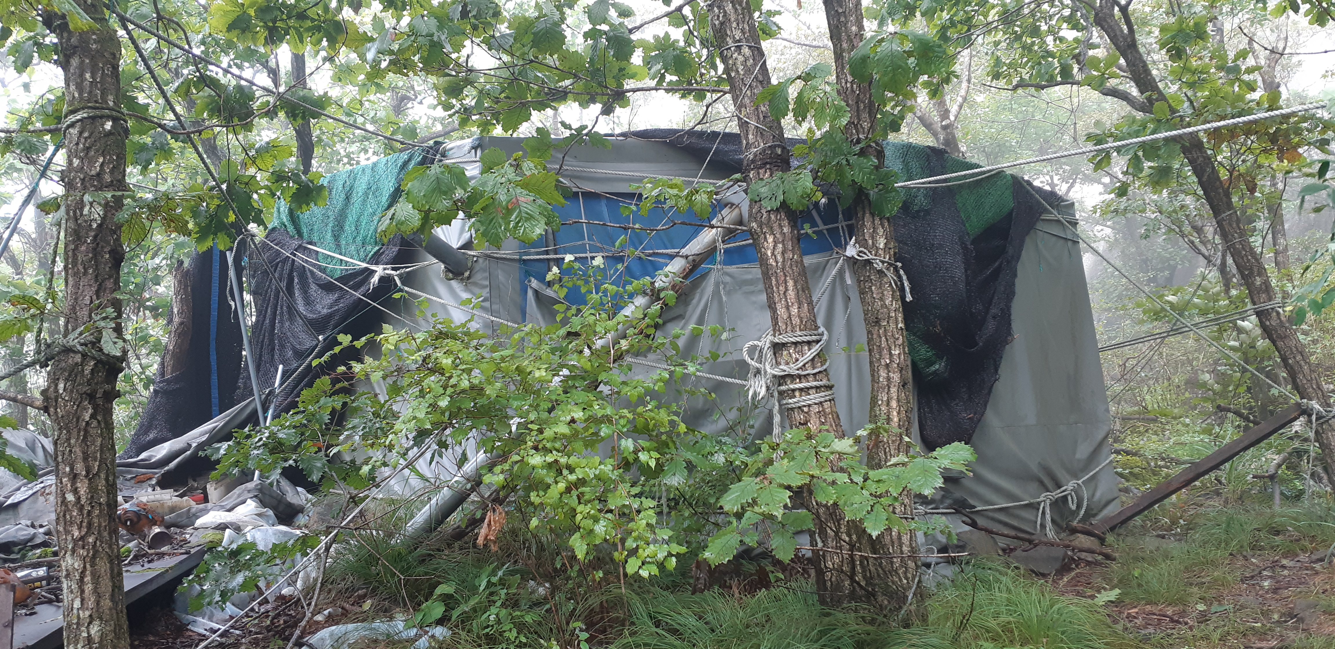 조금전 움막터에서 상부로 옮겨지은 움막(09:00)