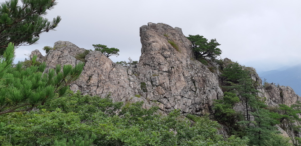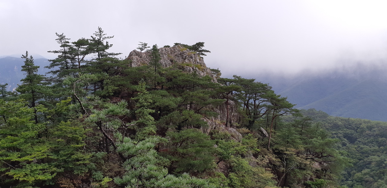 1,056m정도의 조망처에서 바라본 소머리바위 바로 뒤로 범봉과 억산이 보인다(11:23)