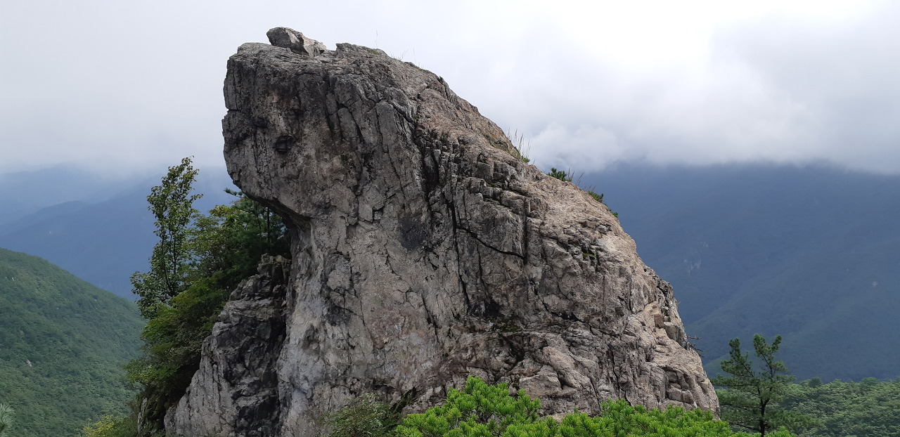 이끼바위를 지나고 능선 모퉁이를 돌아가니 독수리바위가 모습을 나타낸다(10:43)