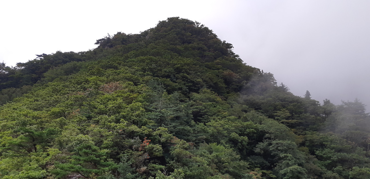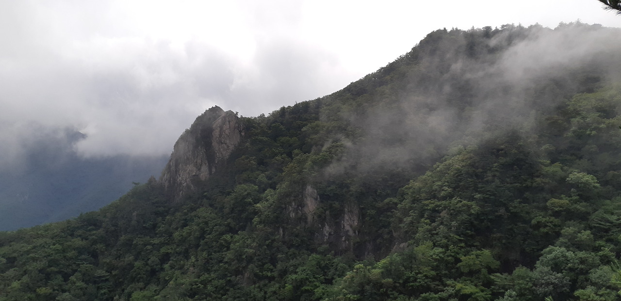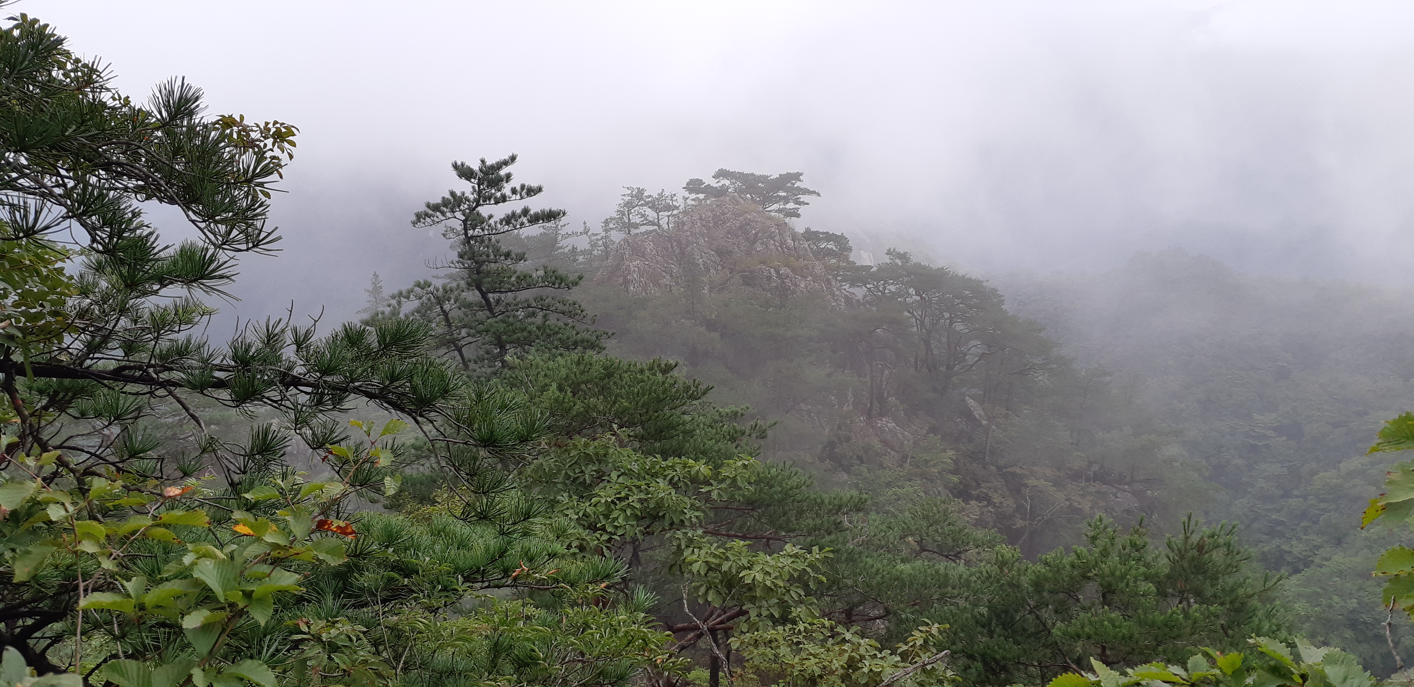 아래 소머리바위가 새로운 손님 맞이를 위해 운무에서 벗어나려 안간힘을 쓰고있다(09:55)