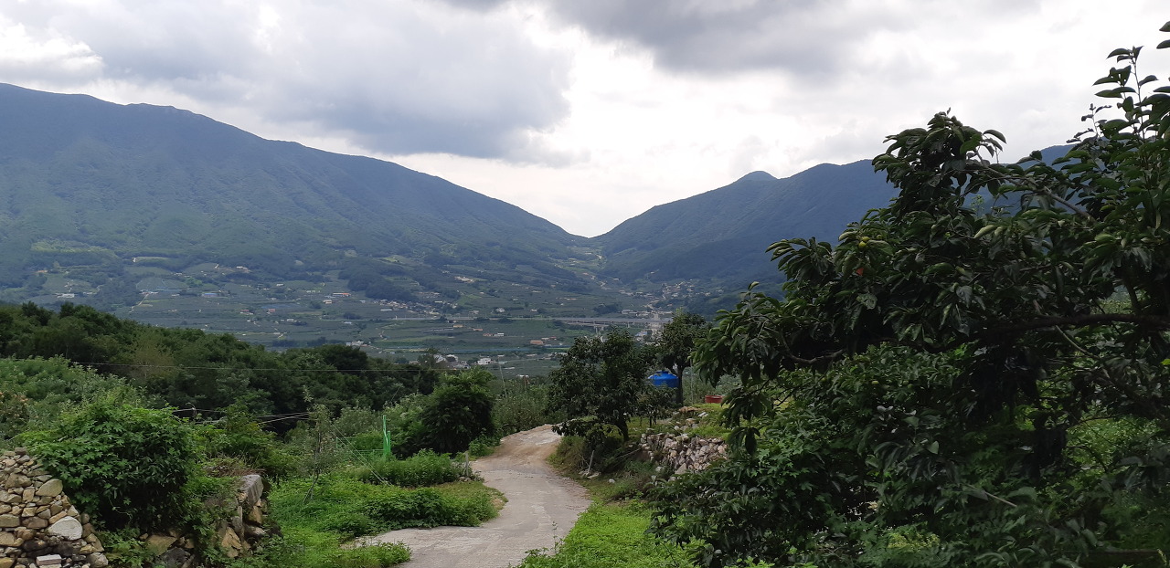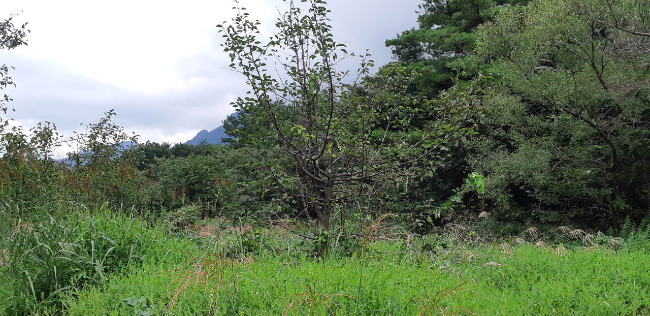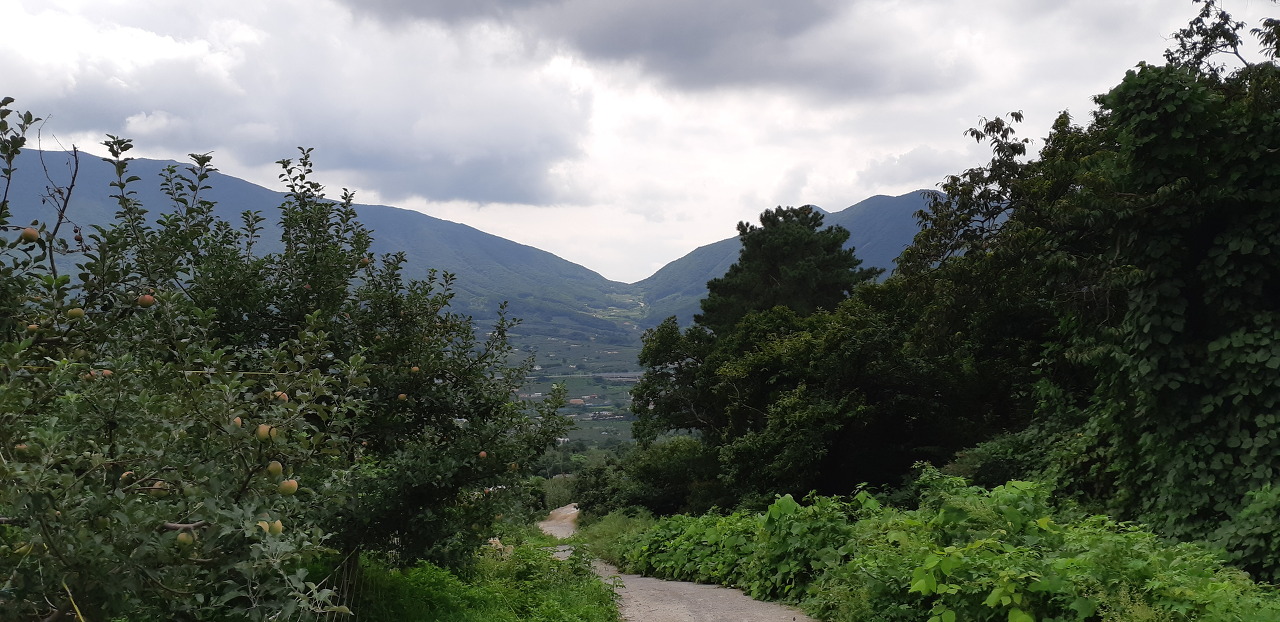 과수원 저쪽으로 도래재의 짤록한 모습이보인다(12:57)