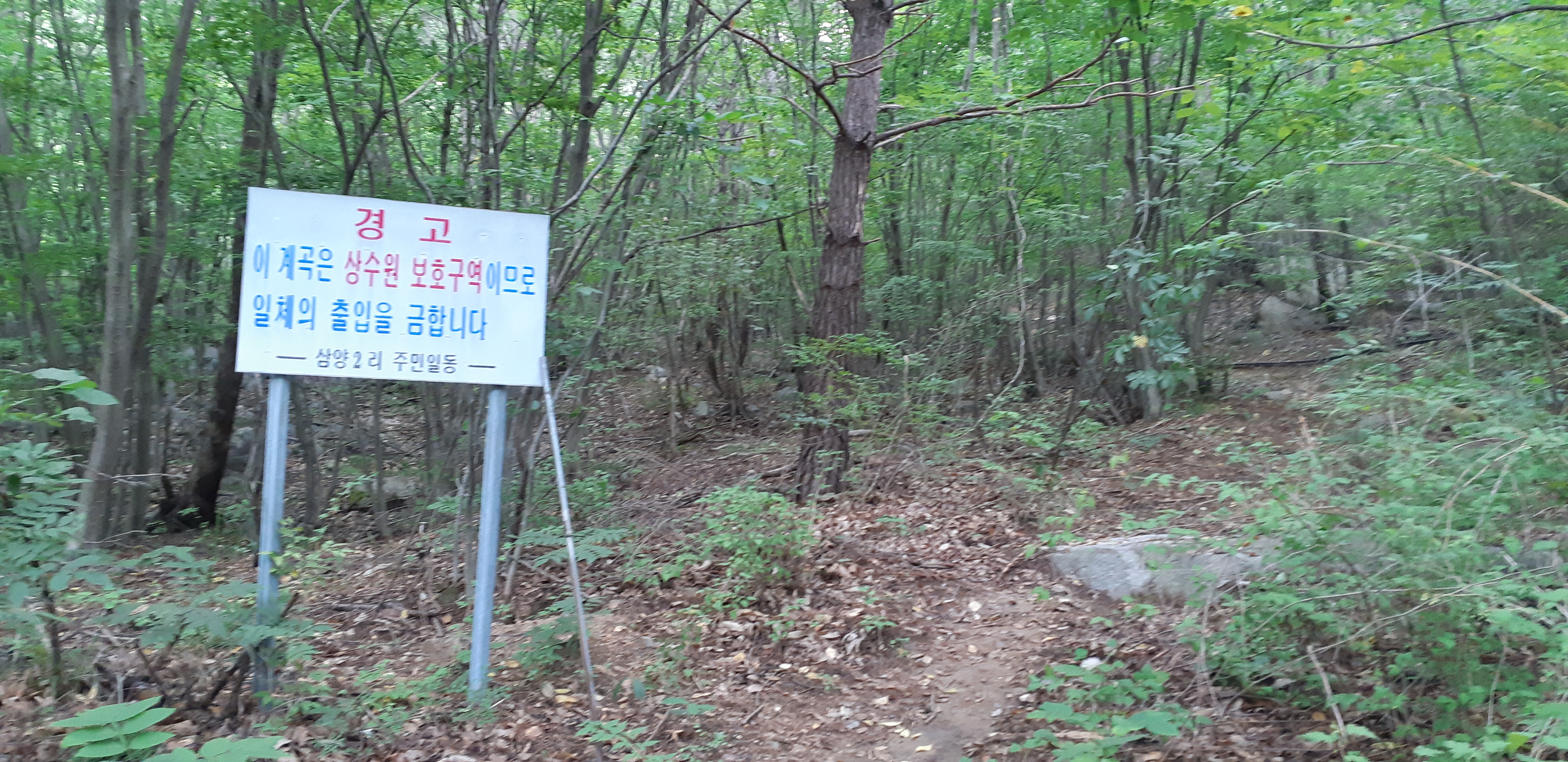 들머리 입구에 상수원 보호구역 경계문이 위치한다/왼쪽에도 계곡에서 올라가는 산길이 있다(07:37)
