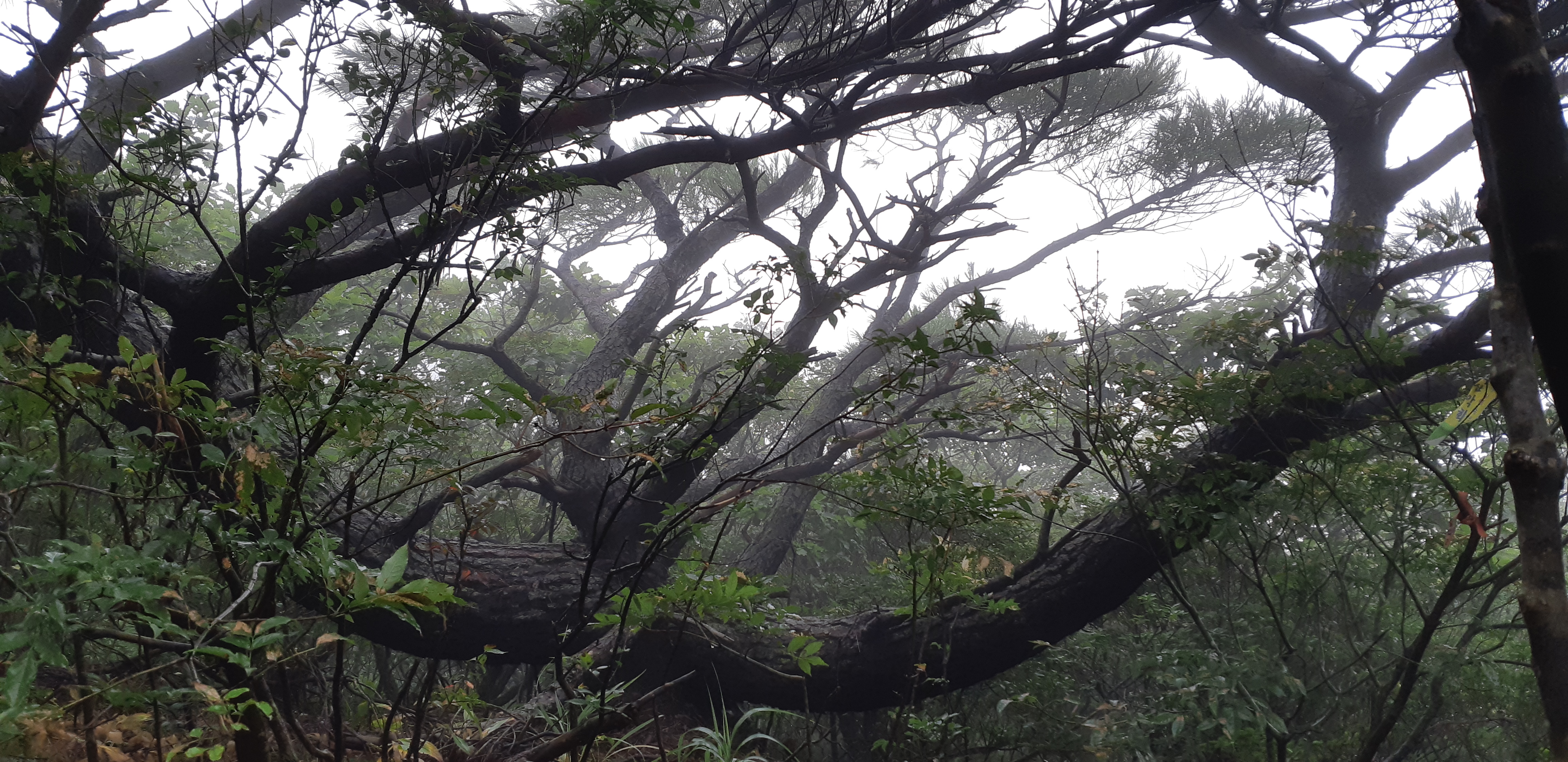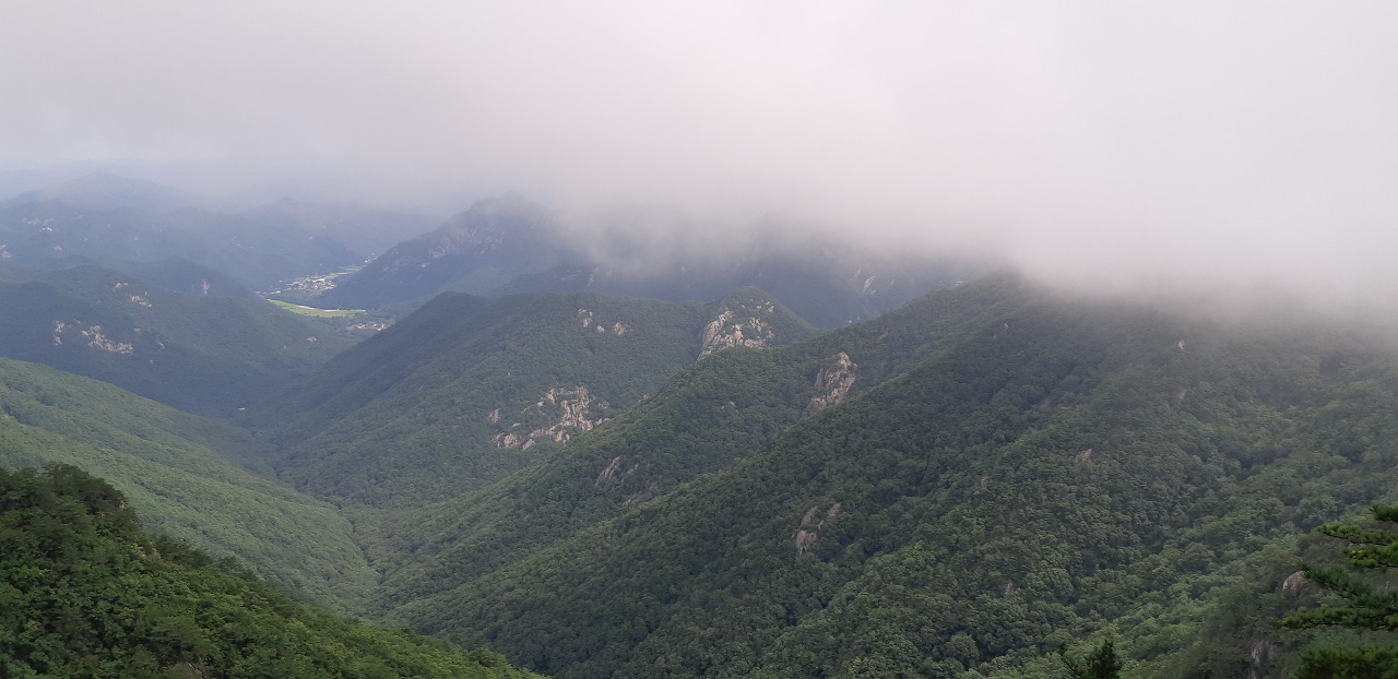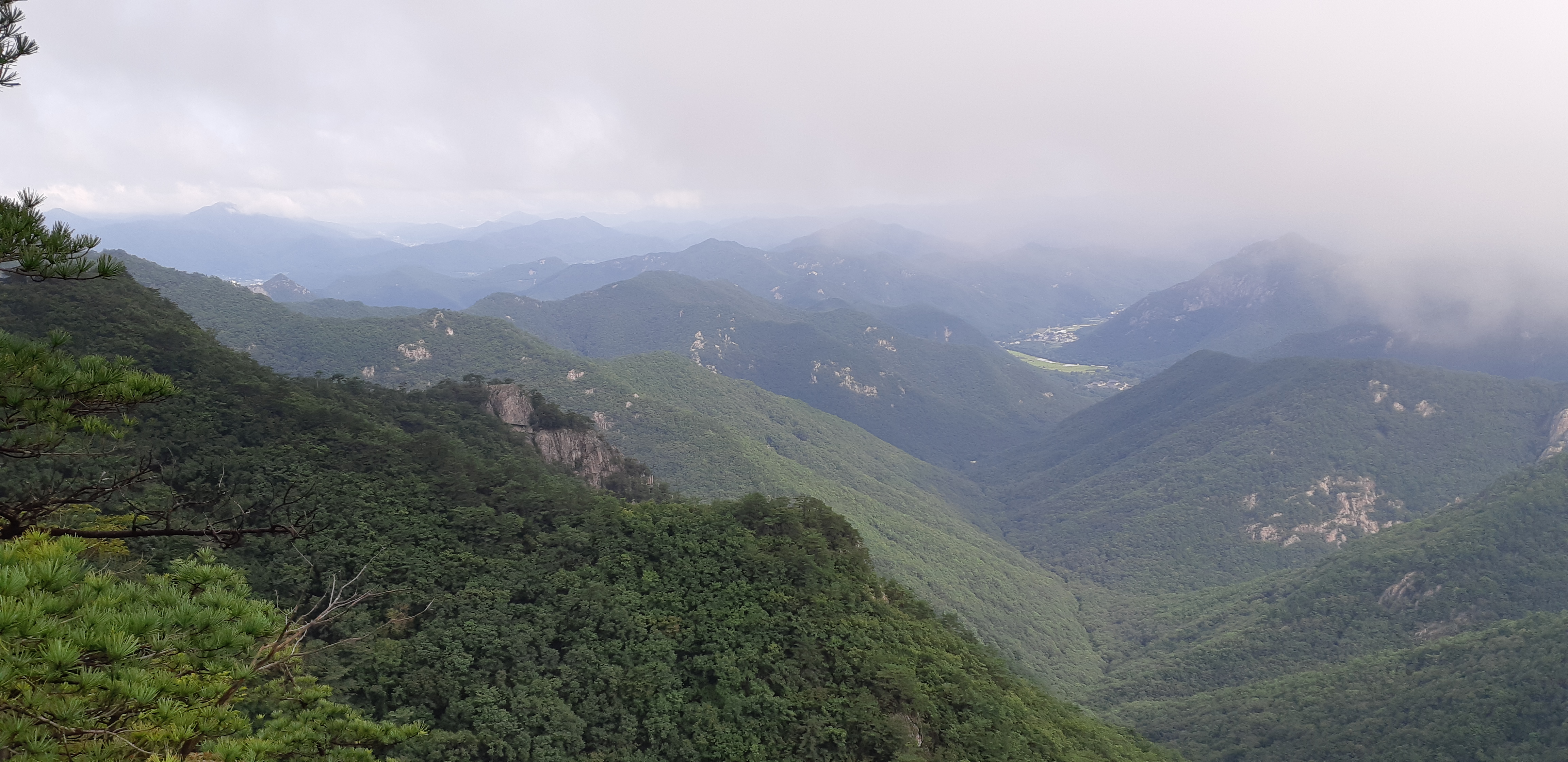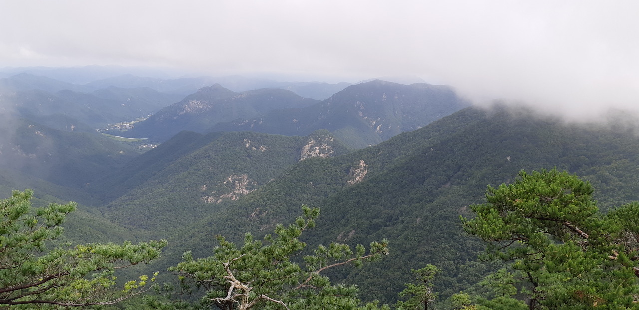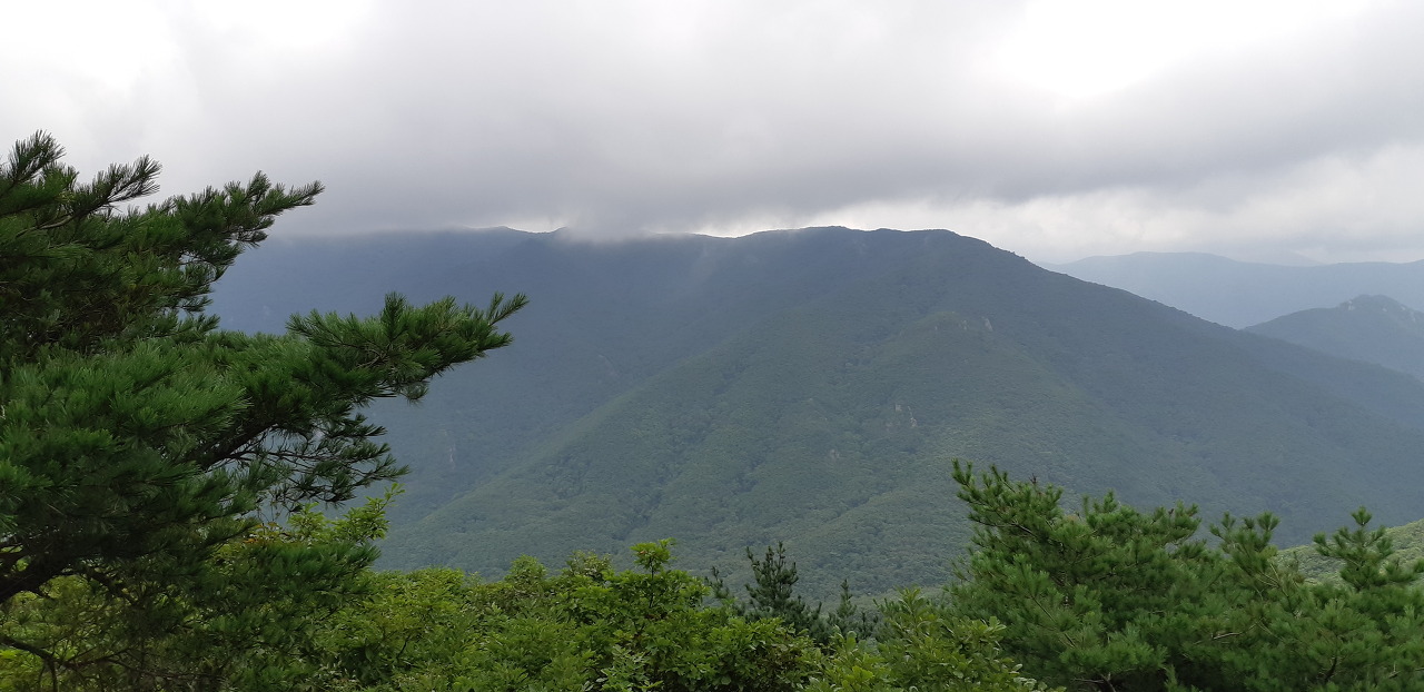 왼쪽으로 가지산에서 아랫재 방향의 능선이 구름사이로 조금씩 들어내보인다(11:05)