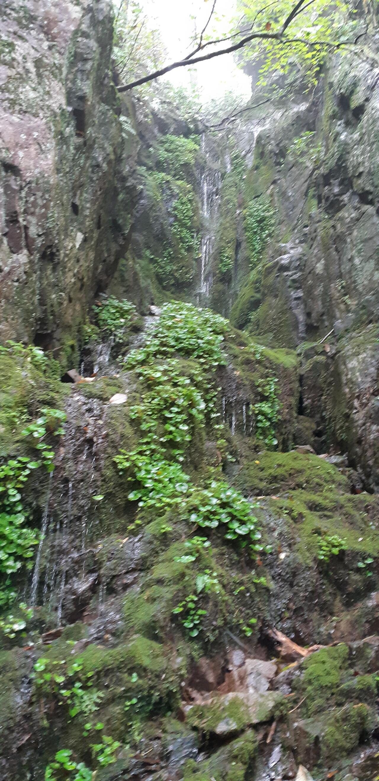 갈림길에서 소머리바위로 향하는데 길도 또렷하고 많은 사람들이 지난 곳이라 위험하지는 않았다. 소머리바위에 오르니 구름이 밀려왔다 살아지기를 반복하는데 선계에 올라와 사바세계를 다스리는 기묘함이 느껴지기도 한다. 가야 할 독수리바위와 지난주 다녀온 굴렁쇠바위 등등 조망을 한껏 즐기고 이끼폭포로 향한다. 이끼폭포는 상하 단으로 이루어져 있는데 규모는 크지 않지만 며칠 전 내린 비로 수량도 적당하여 신비함과 아름다움을 함께느낄 수가 있었다. 이끼바위를 지나고 이제는 마지막의 볼거리인 독수리바위로 간다. 독수리의 날개를 활짝 펼친 형상의 독수리바위에서 조망을 즐기고 운문산 방향인 1,056m정도의 전망봉으로 다시 올라가 이른 점심을 먹는데 왁자지껄 동남아인 4명이 운문산에서 내려온다. 이쪽으로 가면 운문사로 갈수가 있냐는 물음에 두 번째 갈림길인 독수리바위 직전에서 오른쪽으로 내려가라고 일러주었다. 식사를 끝내고 심심이골로 내려간다. 산죽이 깔린 희미한 산길이라 조심조심 OruxMaps 열심히 보며 심심이계곡에 내려서고 운문지맥의 쉼터 역할을 하는 아랫재를 거쳐 하양마을에 도착하면서 홀로 험로 산행을 무사히 마무리 한다.