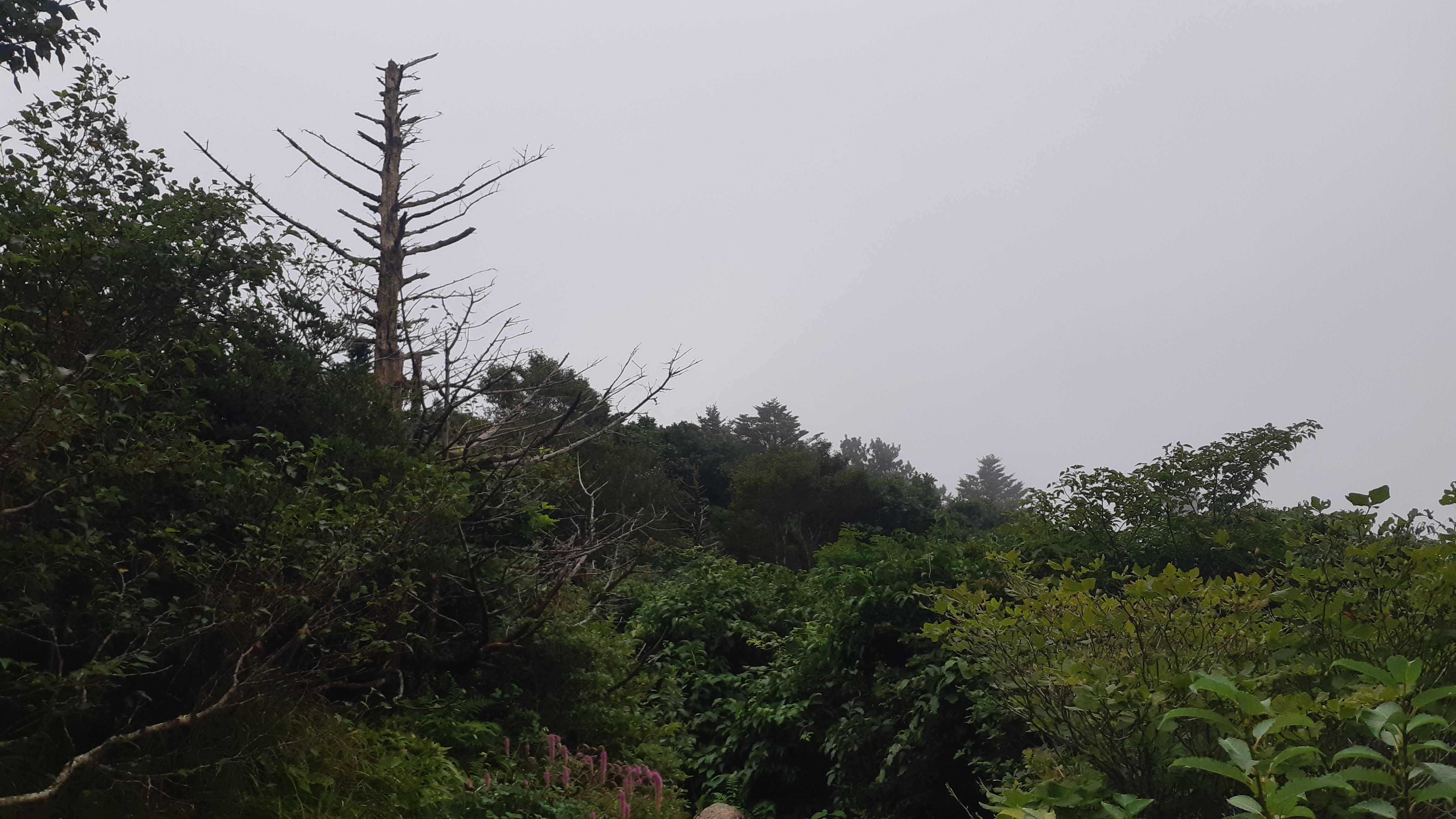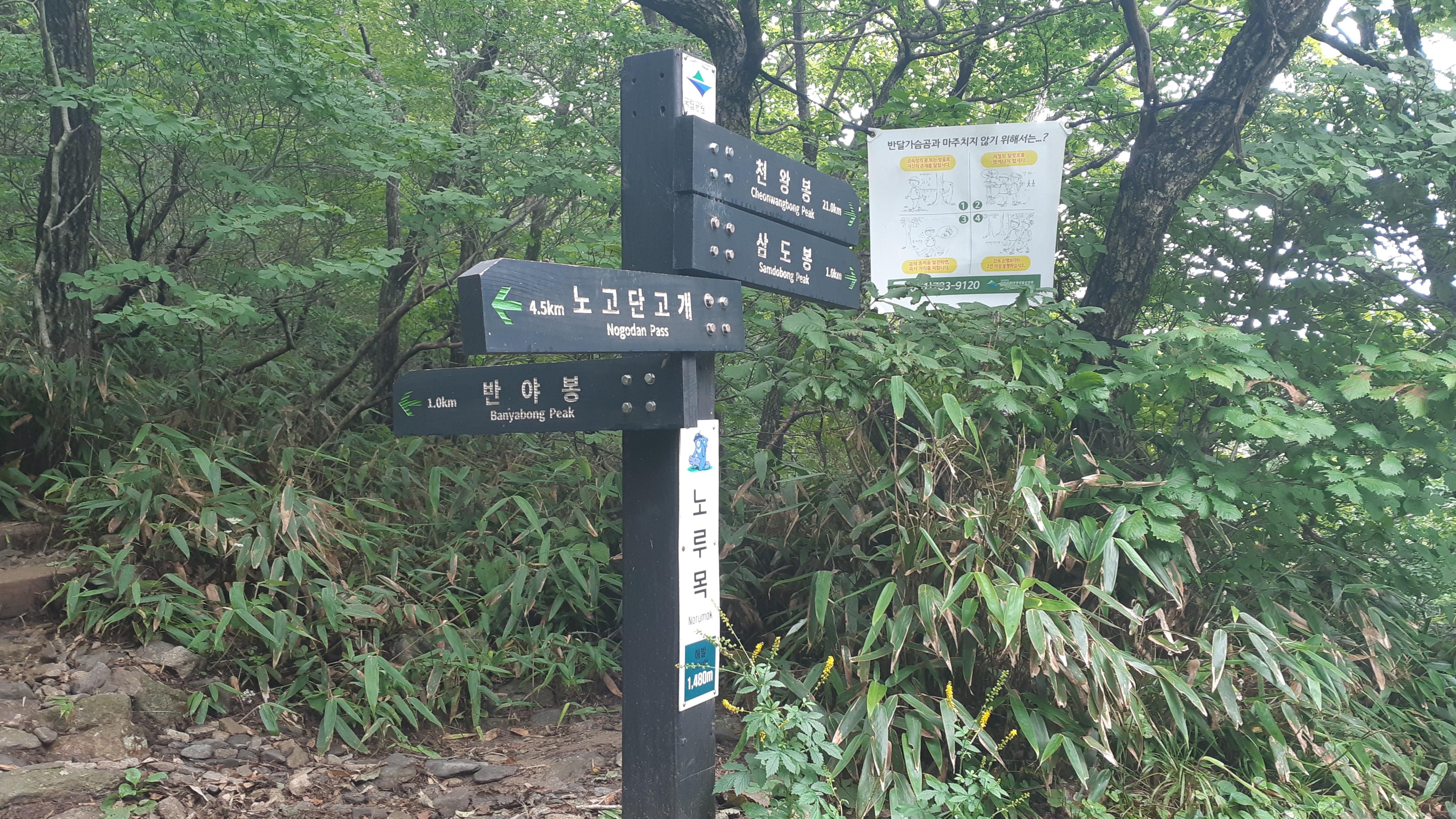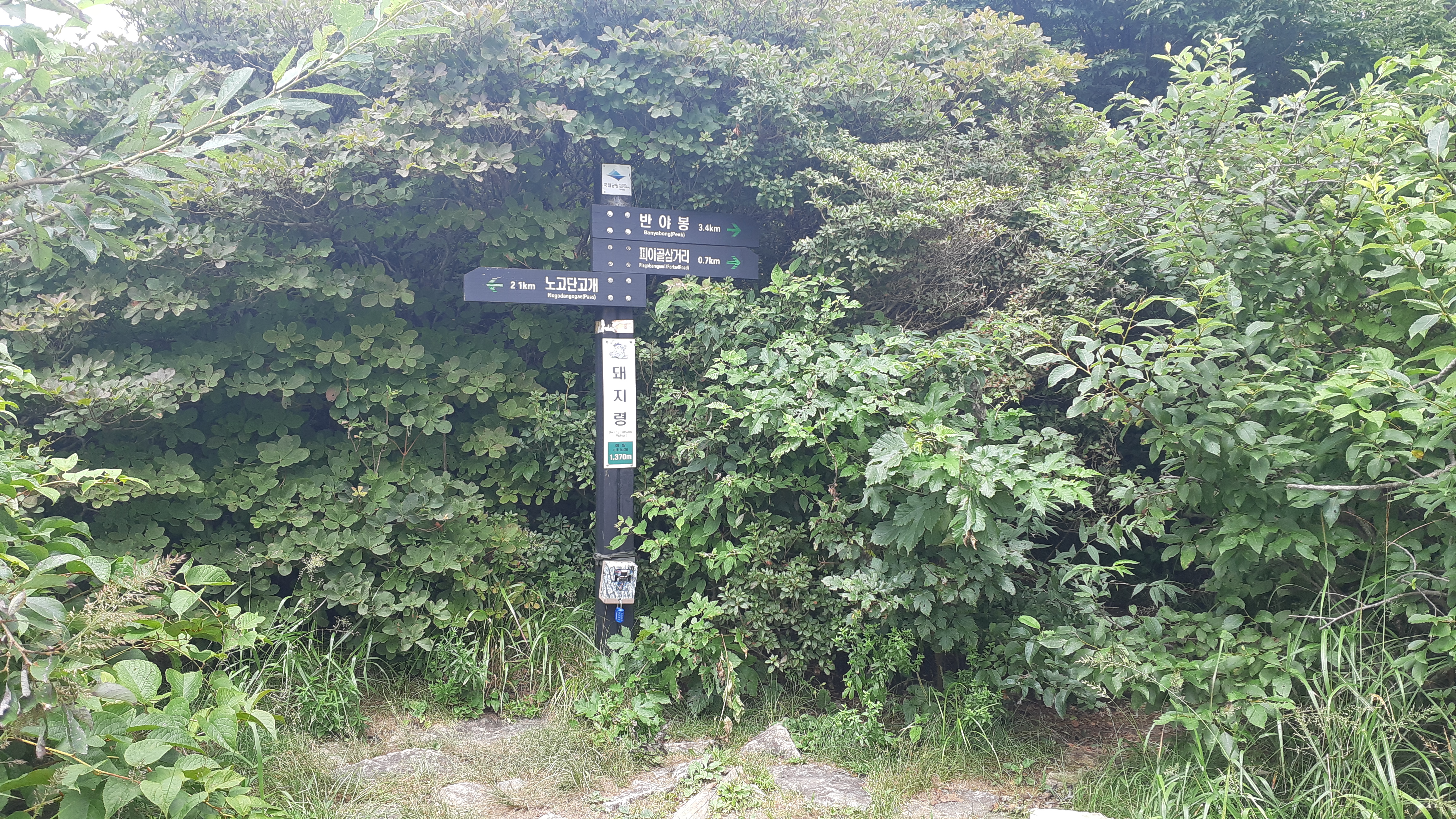 노고단을 되돌아 고개로 내려와 이제 본격적으로 반야봉으로 향한다. 돼지령을 지나고 50여분 걸려 수량이 풍부하여 지리산을 오가시는 산님들의 감로수(甘露水)인 임걸령 샘터에서 달달한 물맛을 확인하고 걸음을 재촉한다. 노루목 삼거리에 닿는데 보통 지리종주시에는 이곳에서 삼도봉으로 곧장 진행하지만 오늘은 반야봉 산행이라 피할 수가 없는 주요 포인터인 셈이다. 이곳의 고도가 1,480m이고 반야봉이 1,732m이니 1km의 거리에 약250m의 고도를 올려야 하는 곳 이기도하다. 노루목 삼거리에서 10여분 오르면 또 다른 삼거리를 만나는데 이곳에서 반야봉을 올랐다 되돌아 내려와야 한다. 흐리긴 하지만 바람도 없는 무더위와 한 바탕 곤욕을 치르고서 반야봉(般若峰) 정상에 닿는다.