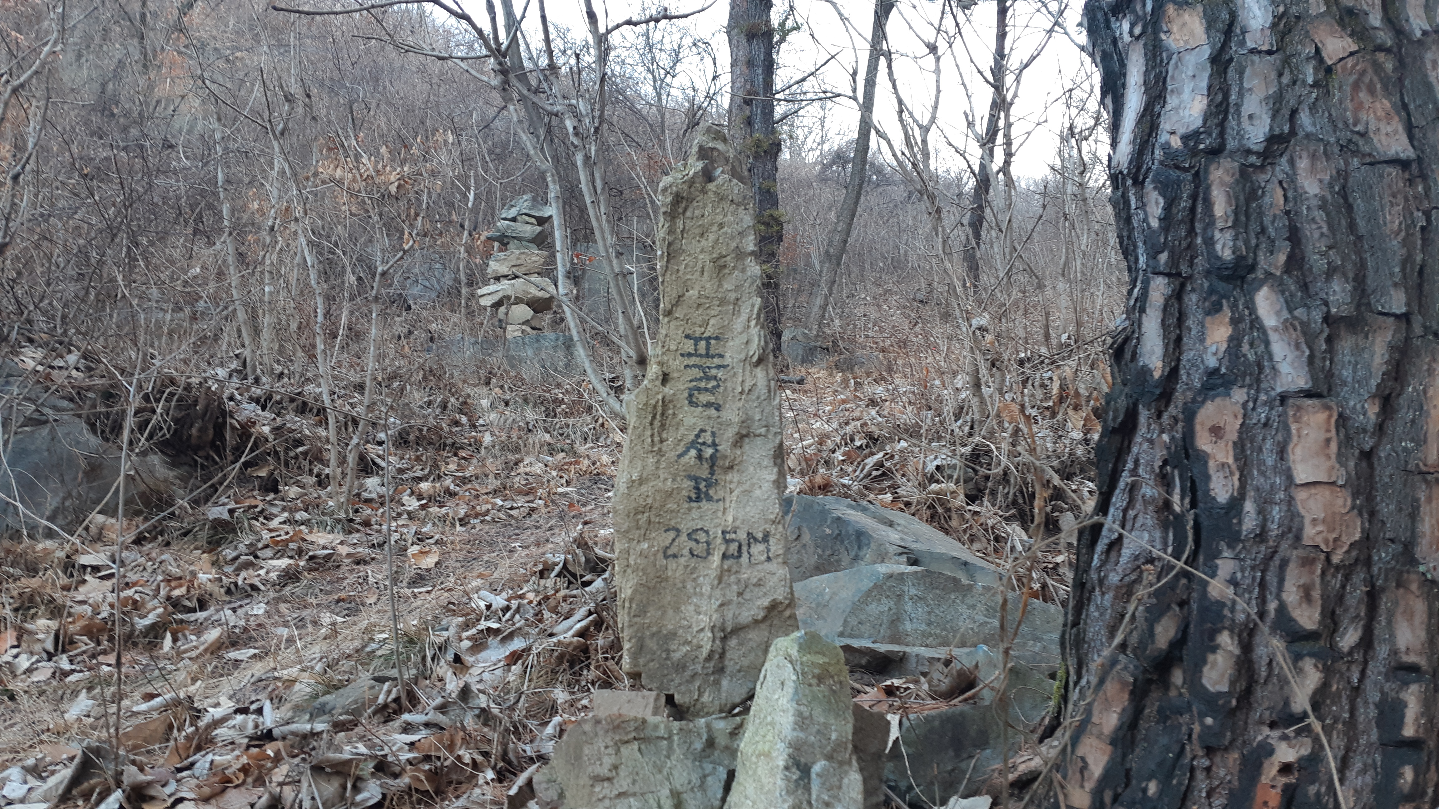 계단 왼쪽 돌탑에 풀섶 295m라 표기하였다(07:57)