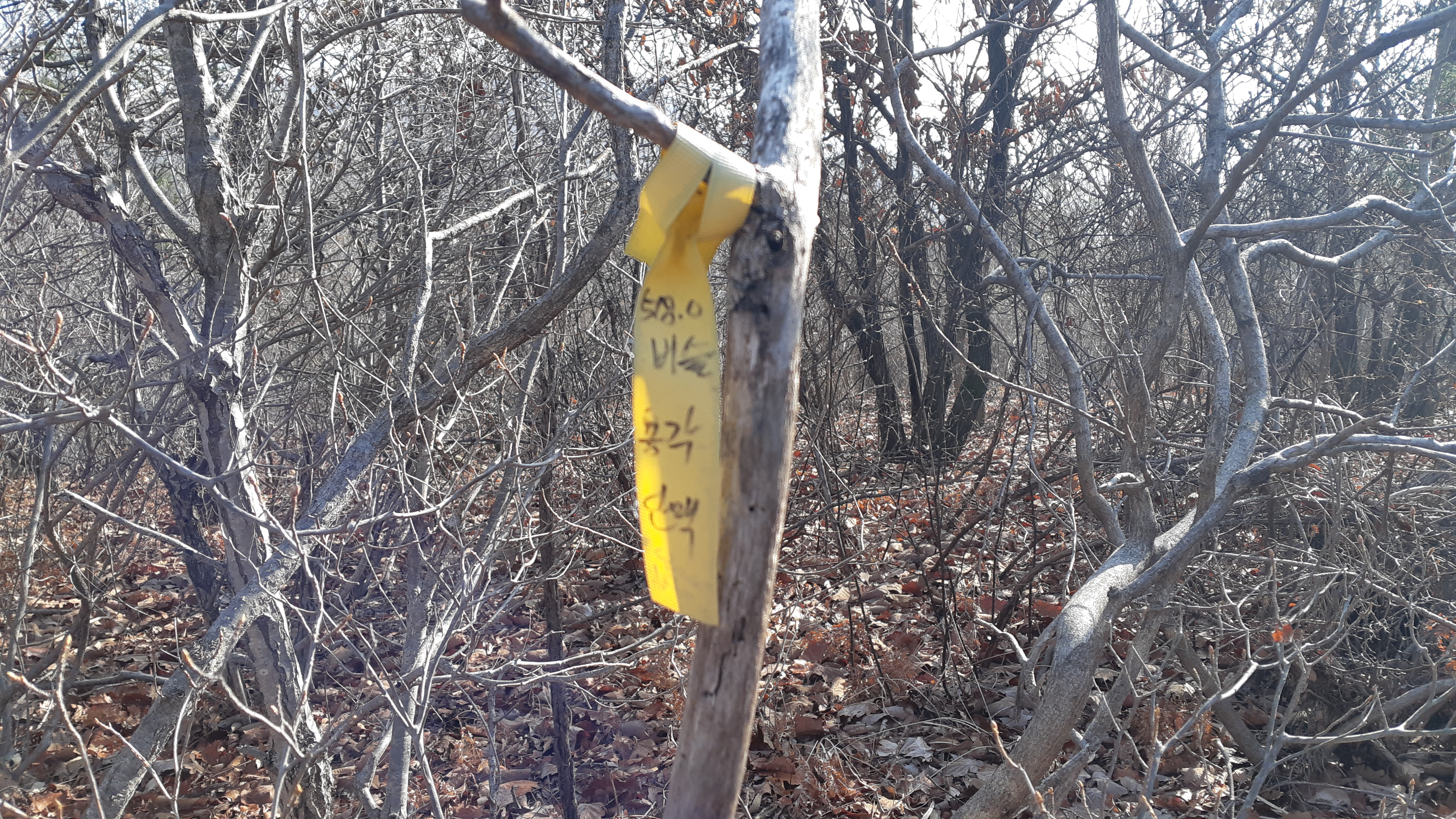 오리산 정상의 표시기/비슬용각단맥이란 표시기가 걸려있다(09:56)
