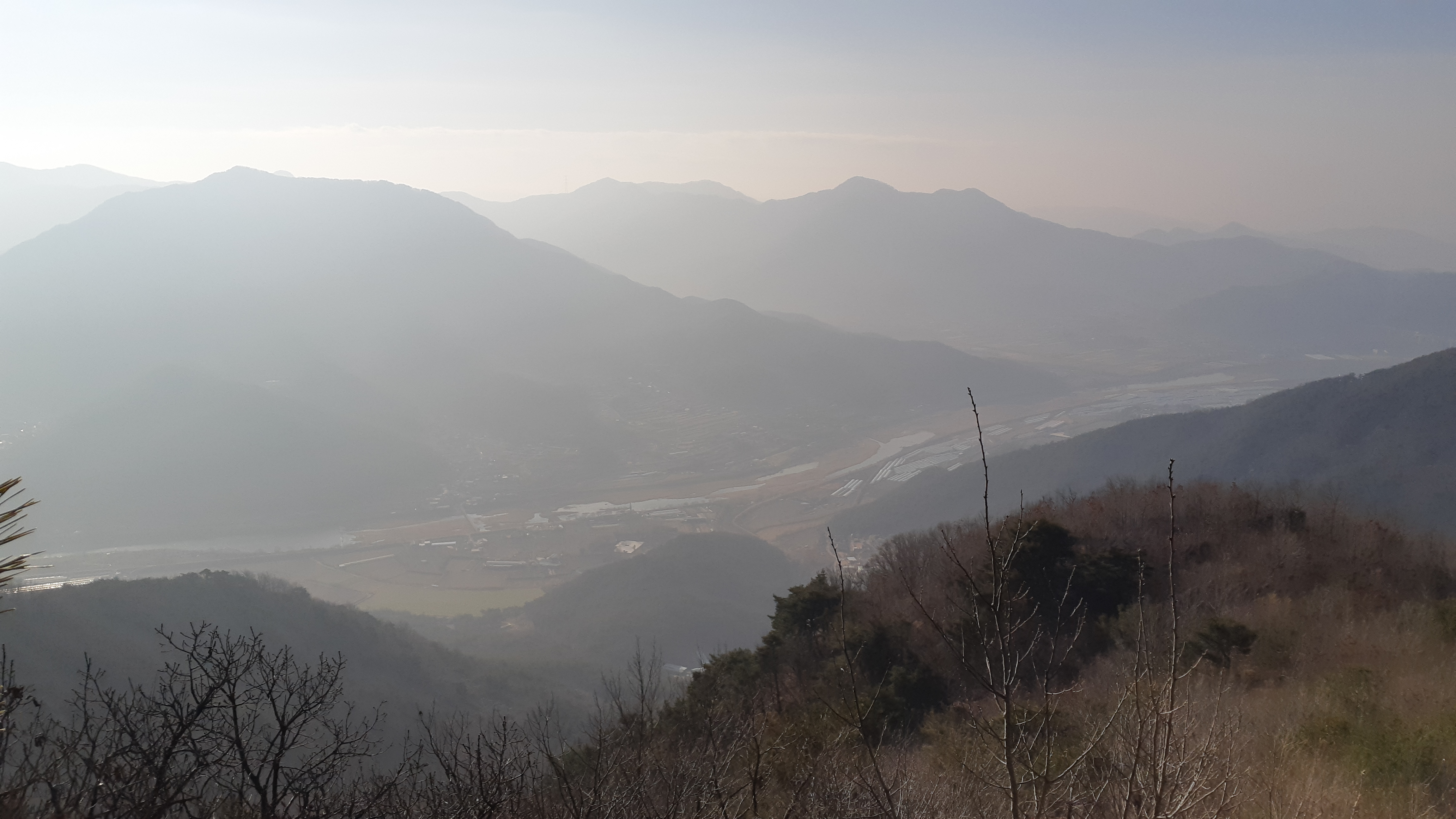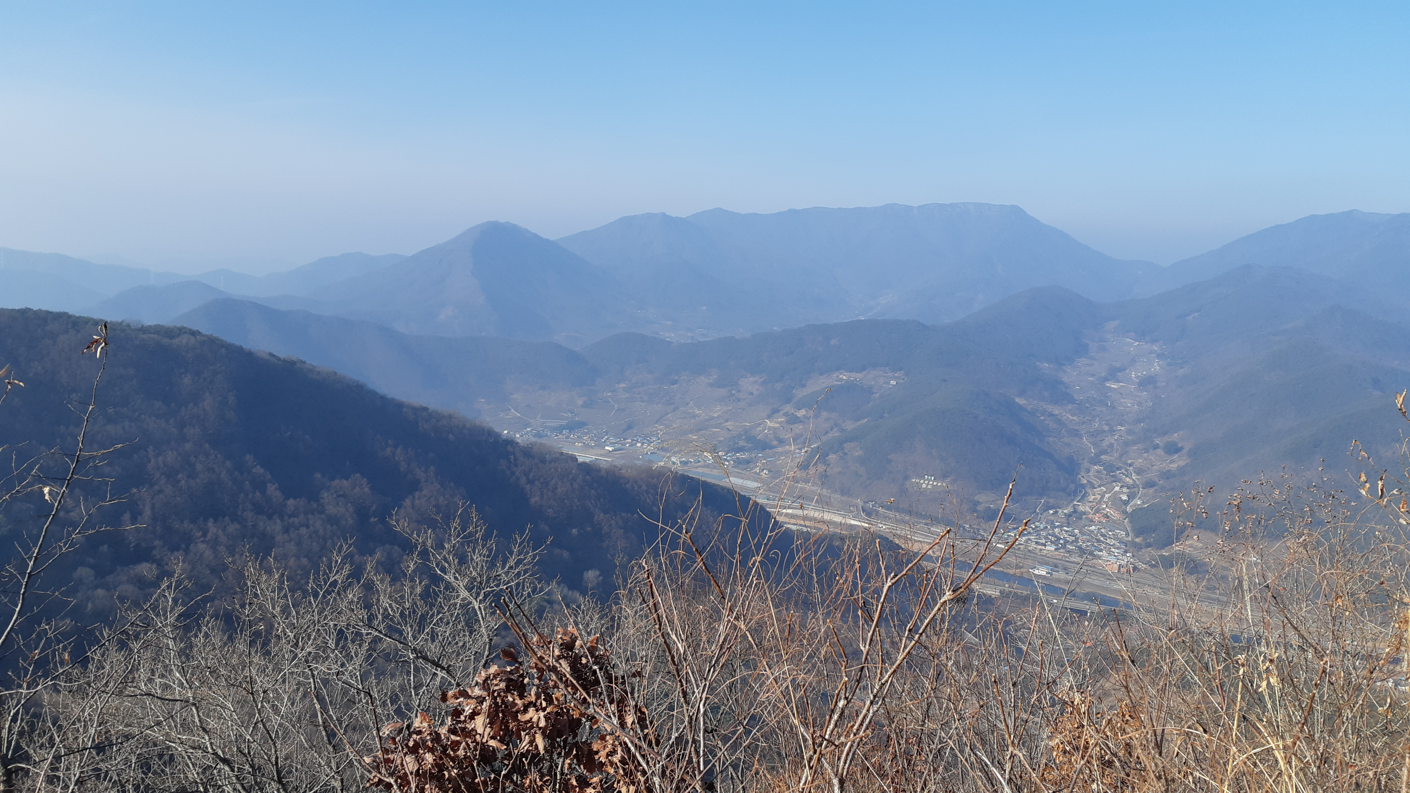 오리산 정상 전망대에서 바라본 밤티재에서 청도 남산으로 이어지는 능선(09:56)