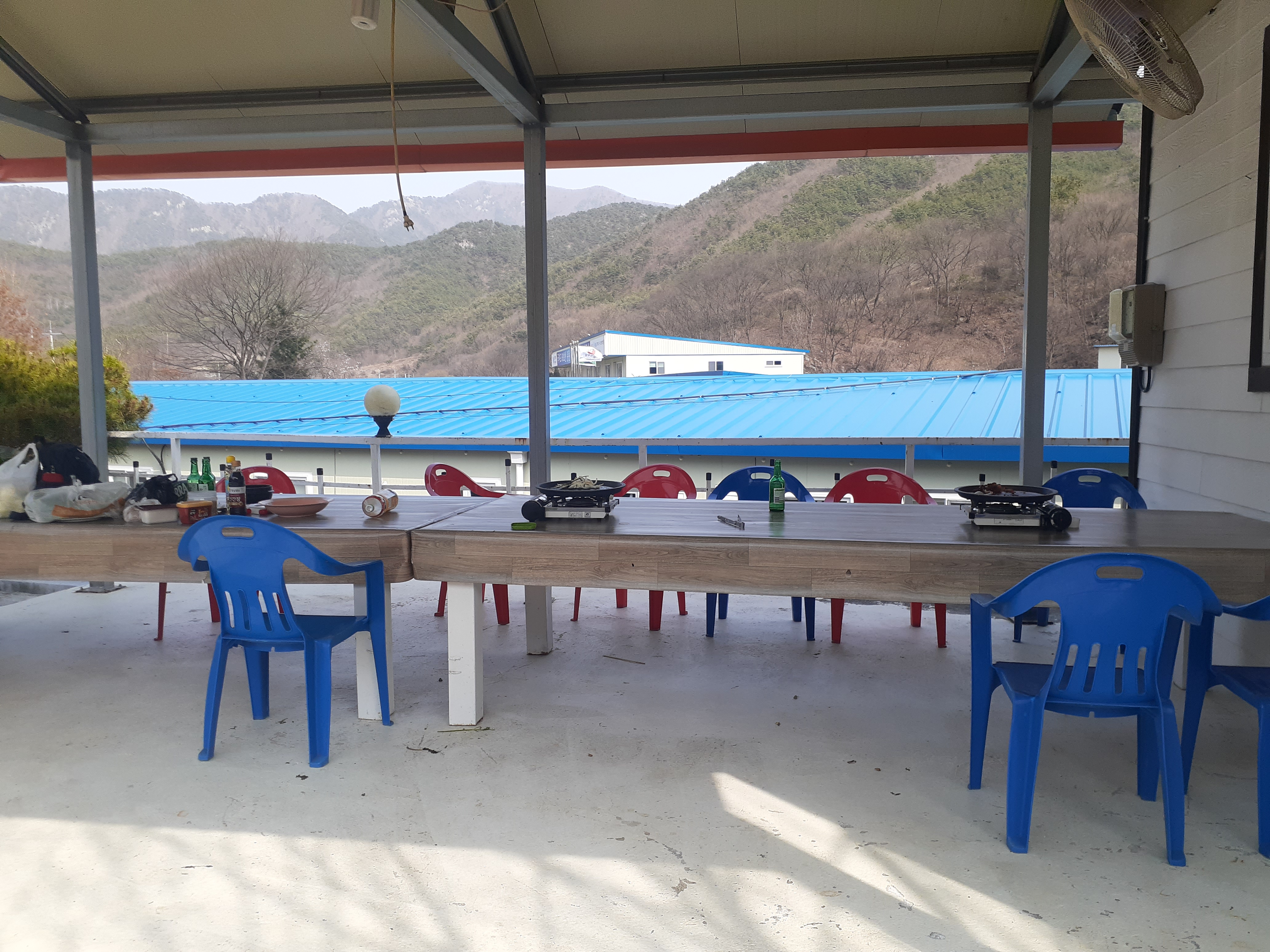 잠시 비가 흩날려 떨어진 기온에 방으로 자리를 옮긴 텅빈 자리