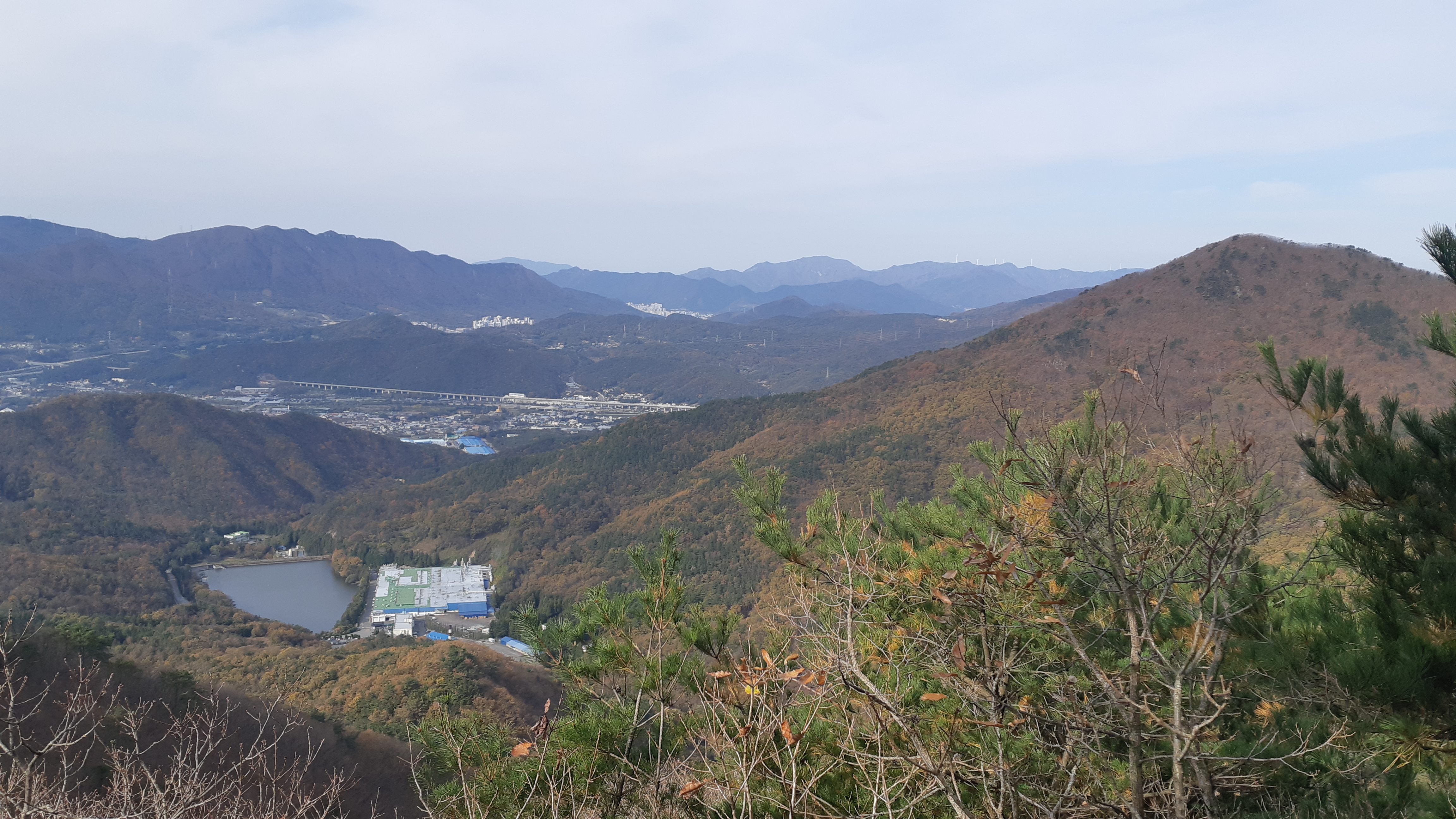 조망처에서 바라본 물금 신도시 뒤로 오봉산과 중앙의 하늘금은 원동의 토곡산이다(10:45)